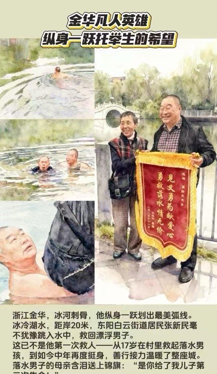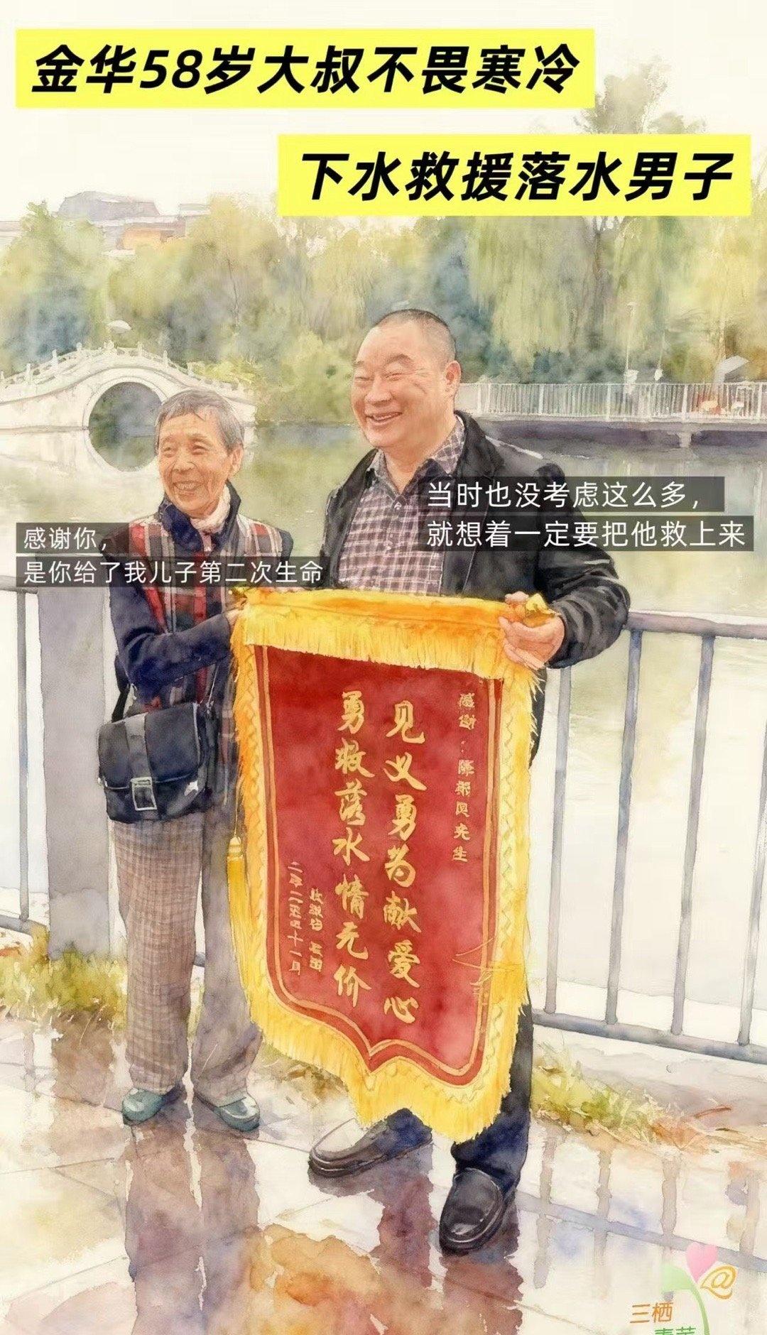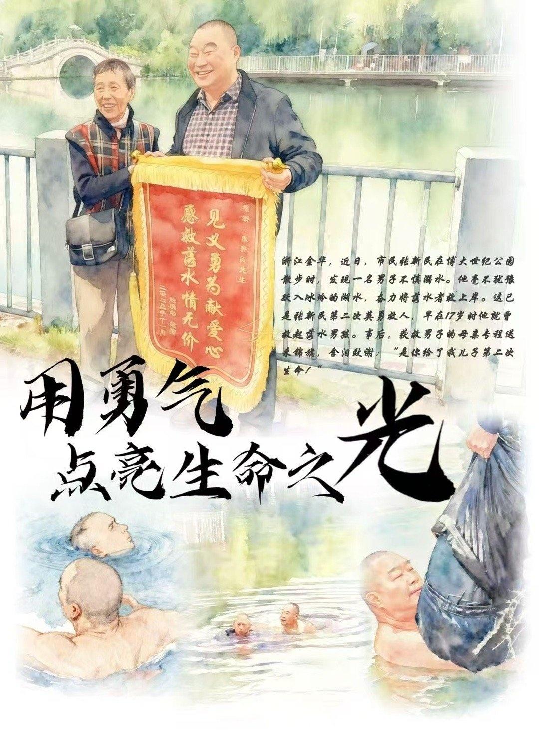 浙江大叔寒冬跳河救人】近日,金华市民张新民在公园散步时,发现一名男子不慎溺水,他毫不犹豫跃入冰冷的湖水,奋力将落水者救上岸。这已是张新民第二次英勇救人,早在17岁时他就曾救起1名落水男孩。事后,获救男子的母亲专程送来锦旗,含泪致谢:“太感谢你了,如果不是你及时出手相救,我们可能再也见不到我儿子了,是你给了我儿子第二次生命。”八婺同心