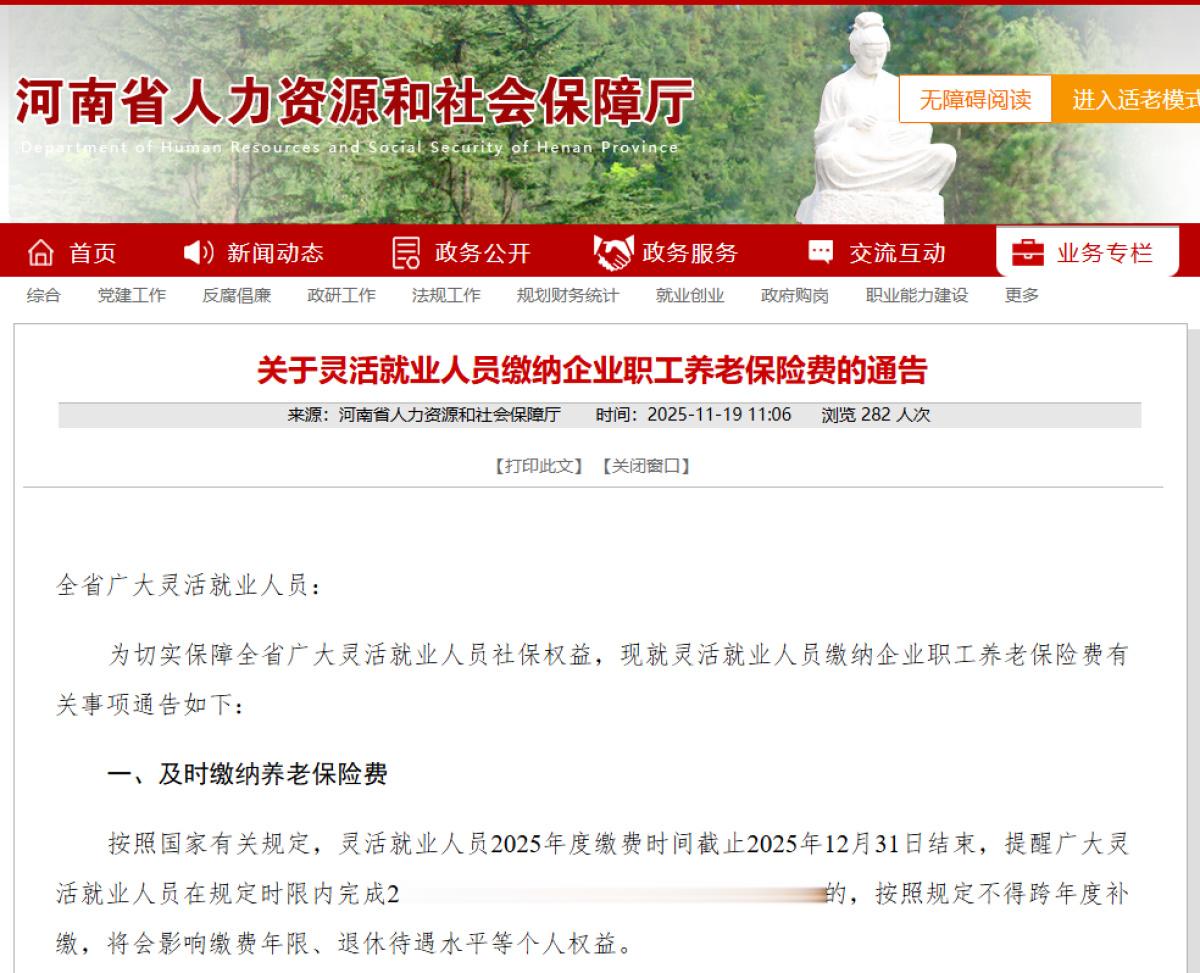 为切实保障全省广大灵活就业人员的社保权益,近日,河南省人力资源和社会保障厅发布《关于灵活就业人员缴纳企业职工养老保险费的通告》,提醒全省广大灵活就业人员及时缴纳2025年度养老保险费,缴纳时间将于12月31日截止,逾期未缴费的,按规定不得跨年度补缴,将会影响缴费年限、退休待遇水平等个人权益。