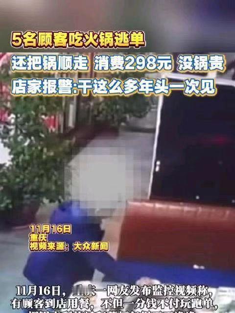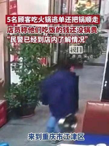 5名顾客吃火锅逃单还把锅顺走,店家报警:饭钱还没锅贵 极目新闻记者 丁伟 “真是开了眼。”11月16日,有重庆icon网友发布监控视频称,有顾客到店中用餐,不但一分钱不付玩跑单,把锅内剩的汤和菜打包得干干净净,临走还将桌上的锅给顺走了。 这起事件令人震惊也令人感到愤怒。顾客不仅在用餐后逃单,还将餐厅的锅和剩余的汤菜一并带走,严重破坏了餐厅的正常经营秩序。店家报警后,相关部门应当依法追究这些顾客的责任,同时也提醒其他餐饮企业加强监控和管理,防止类似事件再次发生。 事件的关键点包括: 顾客用餐后未支付餐费,逃离现场 将餐厅剩余的汤和菜打包带走 甚至顺走了餐厅的锅具 事发地点在重庆 事件被曝光后引发公众关注和讨论 这种行为不仅是经济上的损失,更影响了餐饮行业的正常运营。希望相关部门能够依法追究责任,维护商家的合法权益,也提醒广大消费者文明用餐,遵守公共秩序。