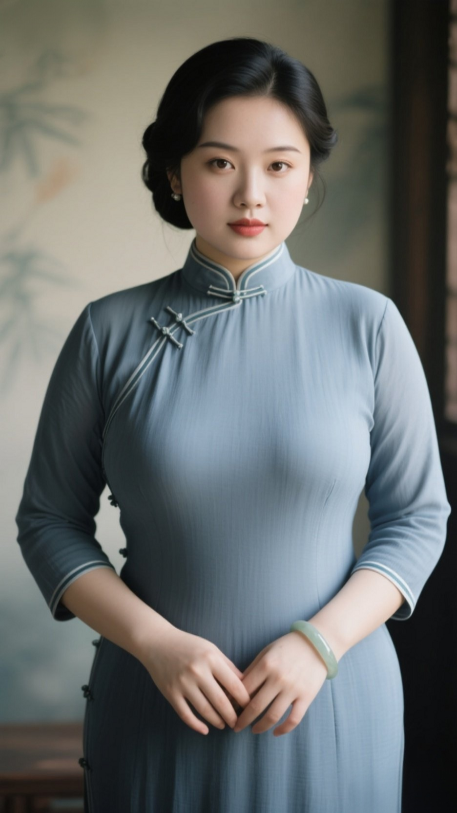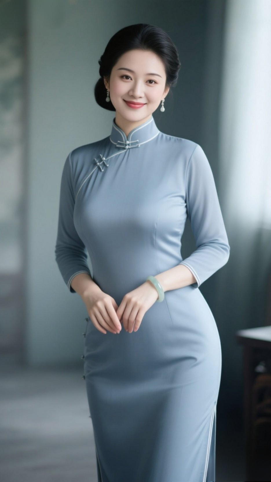 小姐姐身穿烟灰色旗袍,尽显东方柔美。 盘扣勾勒肩颈线条,开衩流露灵动韵味。低挽发髻配珍珠耳坠,玉镯轻转,古雅背景中竹影与提花交织,褶皱藏着手工艺的细腻。 传统与现代交融,简约剪裁承载东方美学,古典韵味永不褪色,定格东方意象。