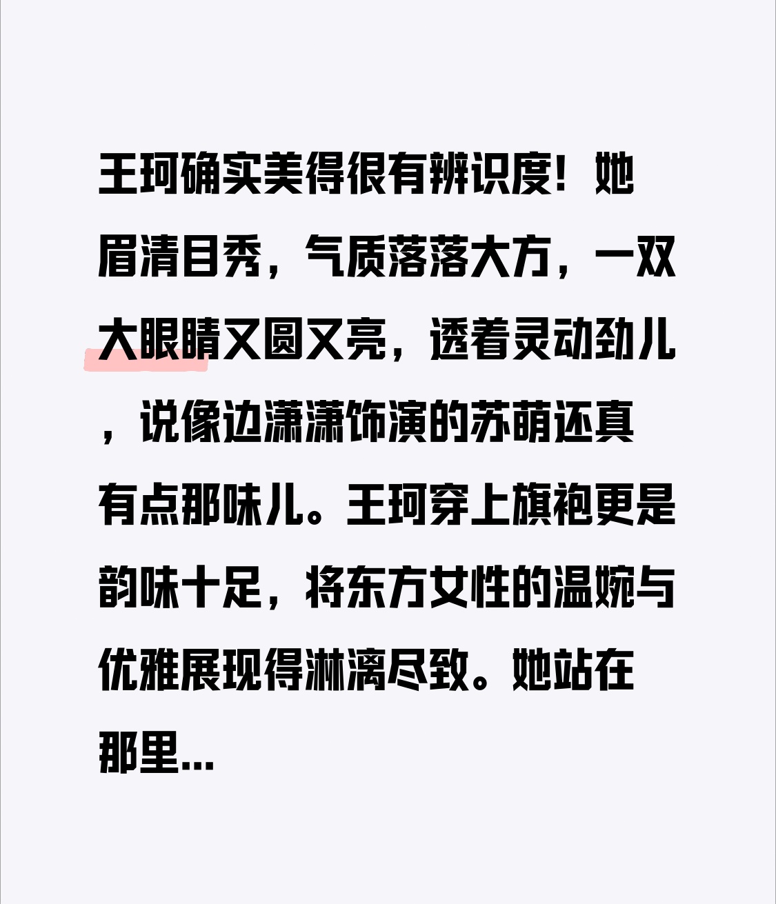 王珂着实美得独具辨识度!她眉清目秀,气质端庄大方,一双大眼睛又圆又亮,满是灵动之意,说她像边潇潇饰演的苏萌,还真有几分相似。 王珂穿上旗袍更是韵味无穷,把东方女性的温婉与优雅展现得恰到好处。她静静站在那里,仿佛自带一种古典韵味,让人忍不住多看几眼。在美女云集的演艺圈,王珂凭借独特魅力脱颖而出,颜值与气质都极为出众,真不愧是众人眼中的大美人。