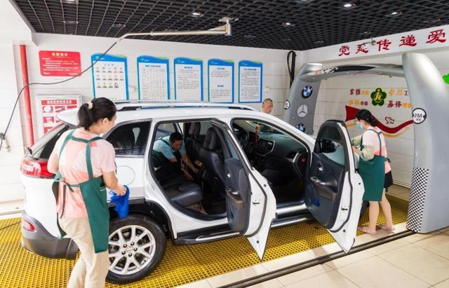 玉祁街道的“喜憨儿洗车中心”,工友们熟练地清洗着车辆