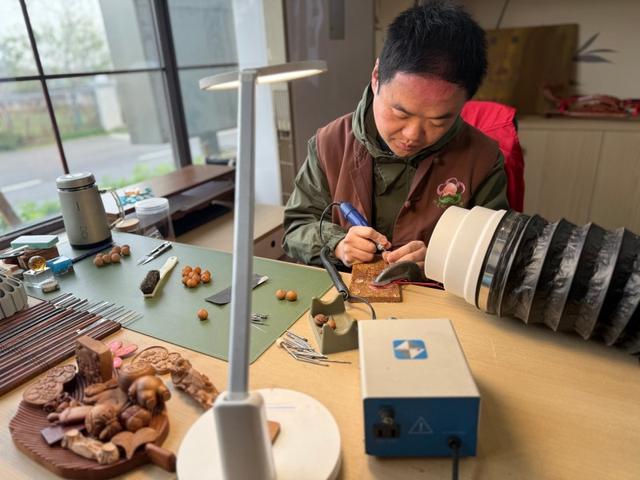 阳山镇“桃文化雕刻非遗工坊”里,18名残疾人成为桃乡“新创客”