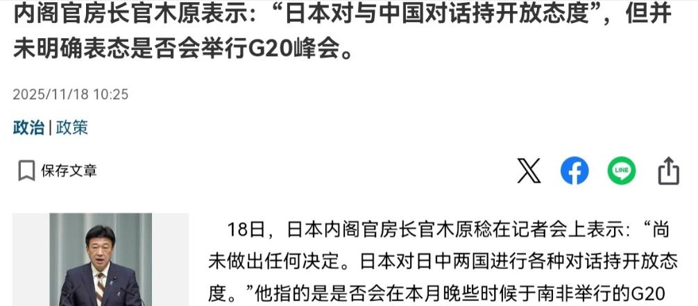 日本出来回应了!在我们明确宣布G20峰会期间没有与高市早苗的会晤安排之后,日本出来回应了! 日本内阁官房长官木原稔在G20峰会期间说了一句“尚未决定”,让中日外交气氛一下子紧张起来。 在这之前,中国已经公开表示不会安排与日本经济再生担当大臣高市早苗见面。两国本该有机会坐下来沟通,但中国抢先把话说死,根本不给会面的余地。 按理说日本就算心里有话,这种场合一般也就不再回应。不过日本偏偏没有选择沉默,而是迟迟等到18日,由内阁高官出面甩出一记模糊的说法,等于又在外界面前留下了点悬念。 之所以中方会直接把门关上,根本原因谁都明白。高市早苗之前说过一些让中国无法接受的话。 她不仅把中国称作“威胁”,还频繁在钓鱼岛、台海等敏感问题上发声,这样的言论已经让中国很难再和她进行高层沟通。 中方其实话已经说清楚了,要求日方收回不当言论,再考虑后续交流,但日本政府迟迟没有明确表态,高市本人更是一点松口的意思都没有。 中方的态度更像是给了日本一次选择的机会,普通的工作联系还可以继续,低级别的沟通也没有中断,但只要问题没解决,高层想见面那就别想。 这条路线划得很清楚,有什么误会和分歧可以谈,但牵扯到原则就必须等到真正正面回应后再说。 其实很多生意人都懂,政治的冷淡总有一天会从外交场合蔓延进经济合作。两国每年几千亿美元的生意都少不了和平稳定作支撑,高层关系一旦出冷风,下面商贸之路就会多出不少麻烦。 审批流程会变慢,投资项目很难像从前那么顺利,有些企业甚至会因为担忧形势把原本的计划搁置。越是和中国合作紧密的日本企业,越是不安,怕政治气氛拖累自家饭碗,谁都不希望看到经济中断。 而且站在日本政府的角度,这回真的是左右为难。一头是本国一些政治派系的压力,那些对中国不太友好的声音在国内也挺有分量;另一头则是中日关系闹僵以后经济上不得不承担的后果。 日本现在就是卡在两头,既不能直接认错,又不敢彻底回绝中国,结果只能用“尚未决定”拖一天算一天。 接下来,局面还不见得能很快翻篇。只要日本对高市早苗言论的事情没有明确说法,这个高层门槛就一直在那放着。 时间越久,没着落的项目就越多,企业界心里那点怀疑也会越压越重。要等两国再想坐回谈判桌,关系可能已经变得更难修复,比现在要花更多代价。