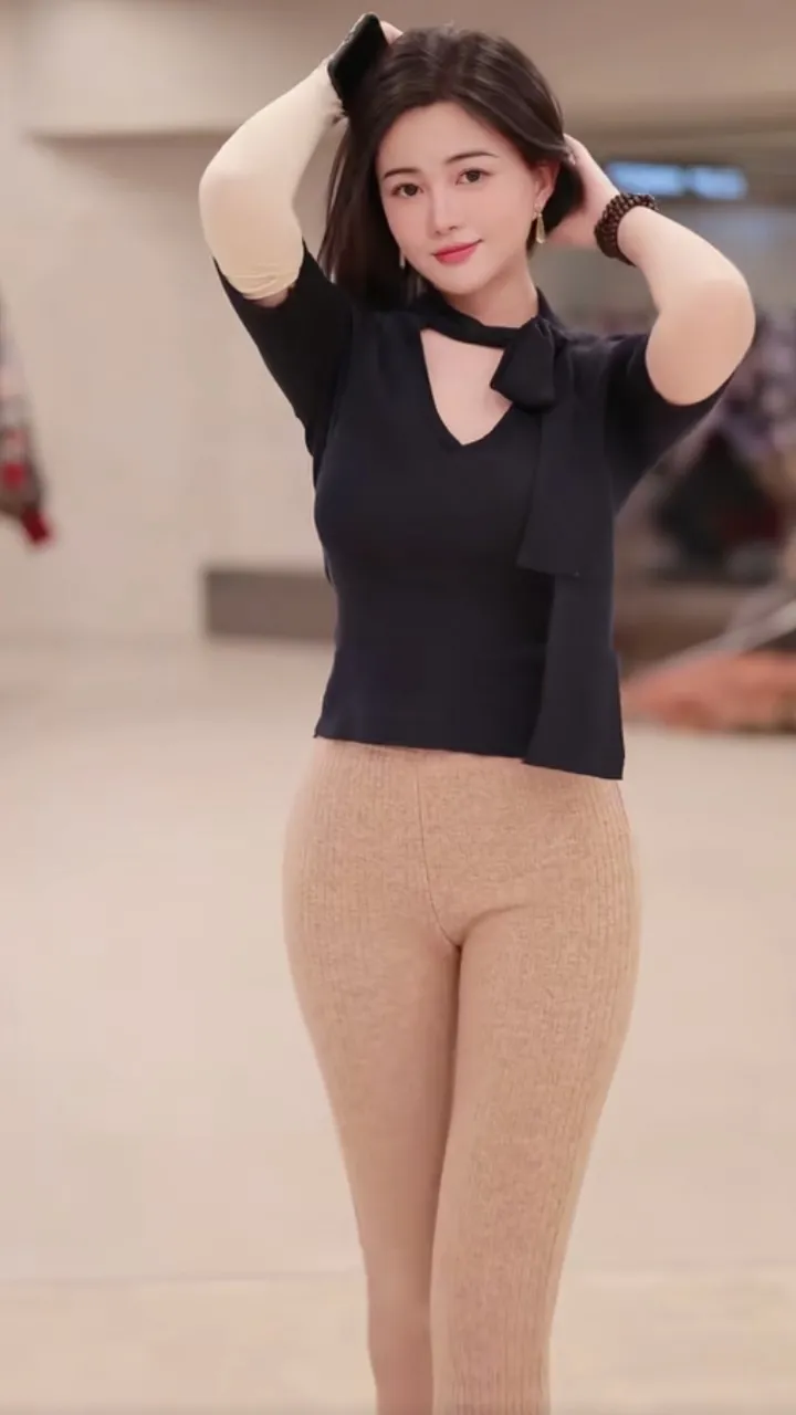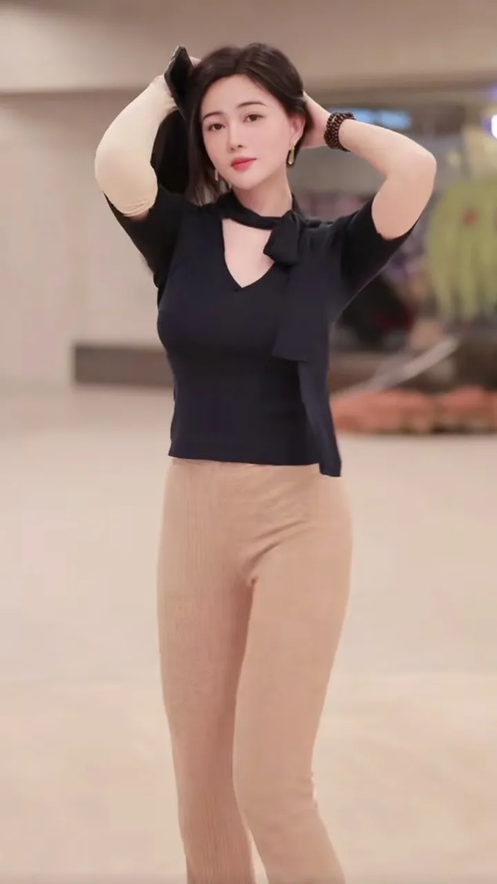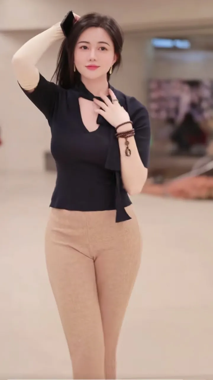 成熟美女,性感大方,美女优雅气质穿搭,黑色上衣搭配米色紧身裤,时尚又显瘦!