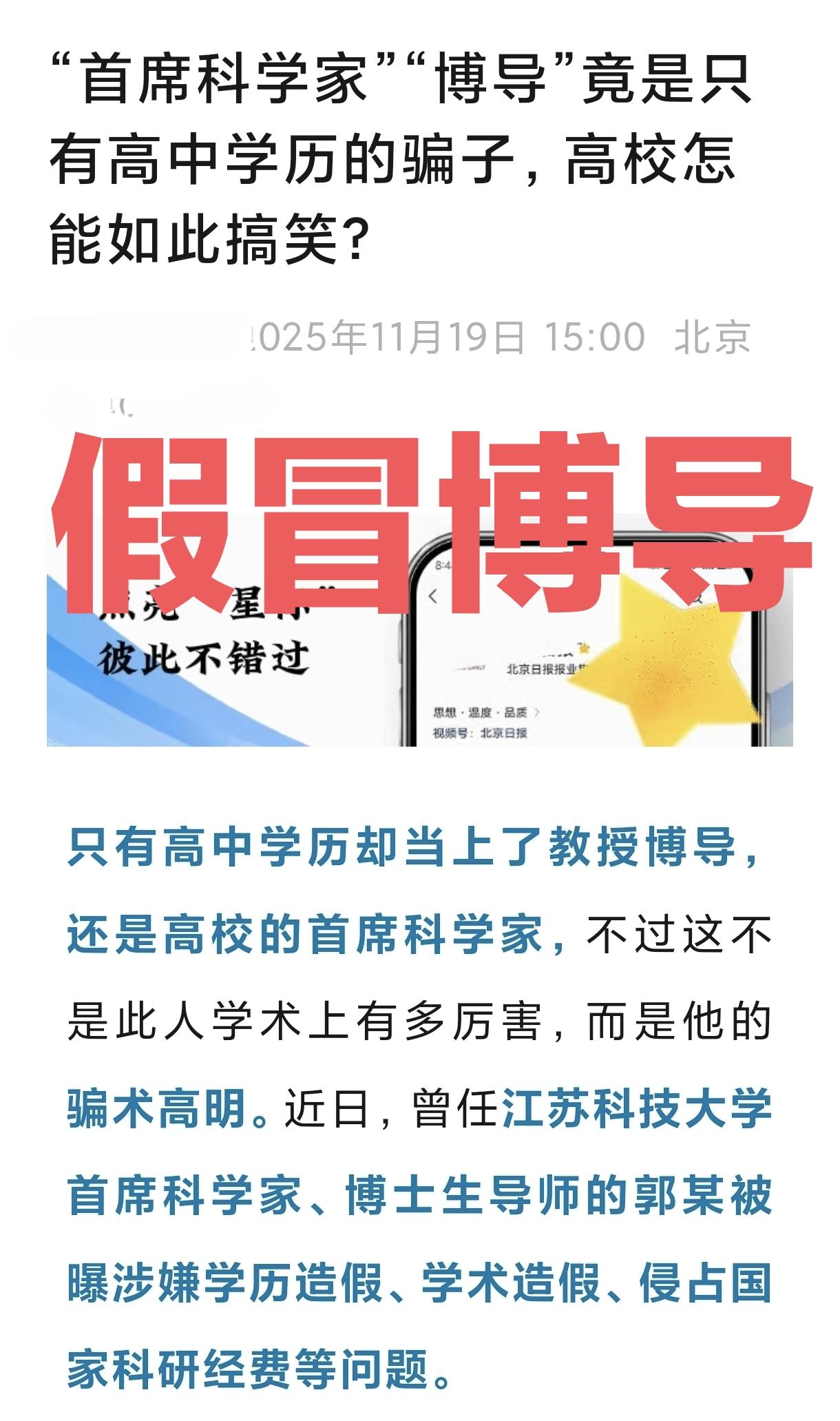 滑天下之大稽了!江苏某高校“首席科学家“、“博士生导师”郭某假冒教授一事真是出大洋相了,也很让人匪夷所思。整个事件的怪异点集中在造假破绽明显却长期未被发现、造假形成闭环等多个方面,具体如下: 1. 造假履历漏洞极易核实却无人查证:郭某仅高中学历,可他虚构的1994年陕西高考状元身份,查当年考试院信息或新闻就能核实;号称的170余篇SCI论文及“郭氏模型”,在核心期刊数据库中根本查不到,所谓6000余次引用更是无稽之谈。就连他说1998年师从澳大利亚卧龙岗大学某院士,而该院士2008年才加盟该校,这种明显的时空矛盾,引进时也未被察觉。 2. 低水平虚假头衔竟能蒙混获高薪厚待:他头上的俄罗斯工程院外籍院士本就是易辨的“水院士”,德国洪堡青年学者等身份也能通过对应机构官网核实。但江苏科技大学不仅聘他为首席科学家、博导,还给出140万年薪、300万安家费及每年超500万科研经费,涉及金额达数千万,反差极为离谱。 3. 毫无专业能力却授课指导学生两年:他讲授《位错理论》等专业课程时毫无相关学术积累,授课内容脱离实际,还让学生跟着自己的虚假课题做研究。可这种明显的“南郭先生”状态,在长达两年时间里既没被同事戳破,也没因学生反馈而暴露。 4. 造假形成媒体与身份的闭环怪圈:今年5月多家媒体曾专题报道他的“辉煌履历”和“科研成果”,这些报道反过来又成了他身份的“背书”,甚至他团队的技术还入选年度“十大科技进展”。这种“媒体宣传—身份固化”的闭环,让本就漏洞百出的造假行为反而不断升级。 5. 暴露审核漏洞的诸多反常细节:他2023年入职,2025年9月被举报,学校时隔两月才通报,期间的拖延令人费解;更反常的是他还曾和包含副校长在内的学校人员共同申请专利,如此近距离的合作竟未让其造假露馅,凸显出学校审核环节形同虚设的怪异。 看面相这人岁数也不小了,这是在其他地方当了多少年的博导和教授了?当初怎么进的高校,而且这么多年教了多少博士生,都教了什么?不能就一句他是骗子就完事了吧。这位江湖骗子在校期间不做报告不讲课?日常也没人和他交流科研方向?还是天天装聋作哑一言不发?一个高中学历的人究竟如何能冒充专家学者的?匪夷所思!