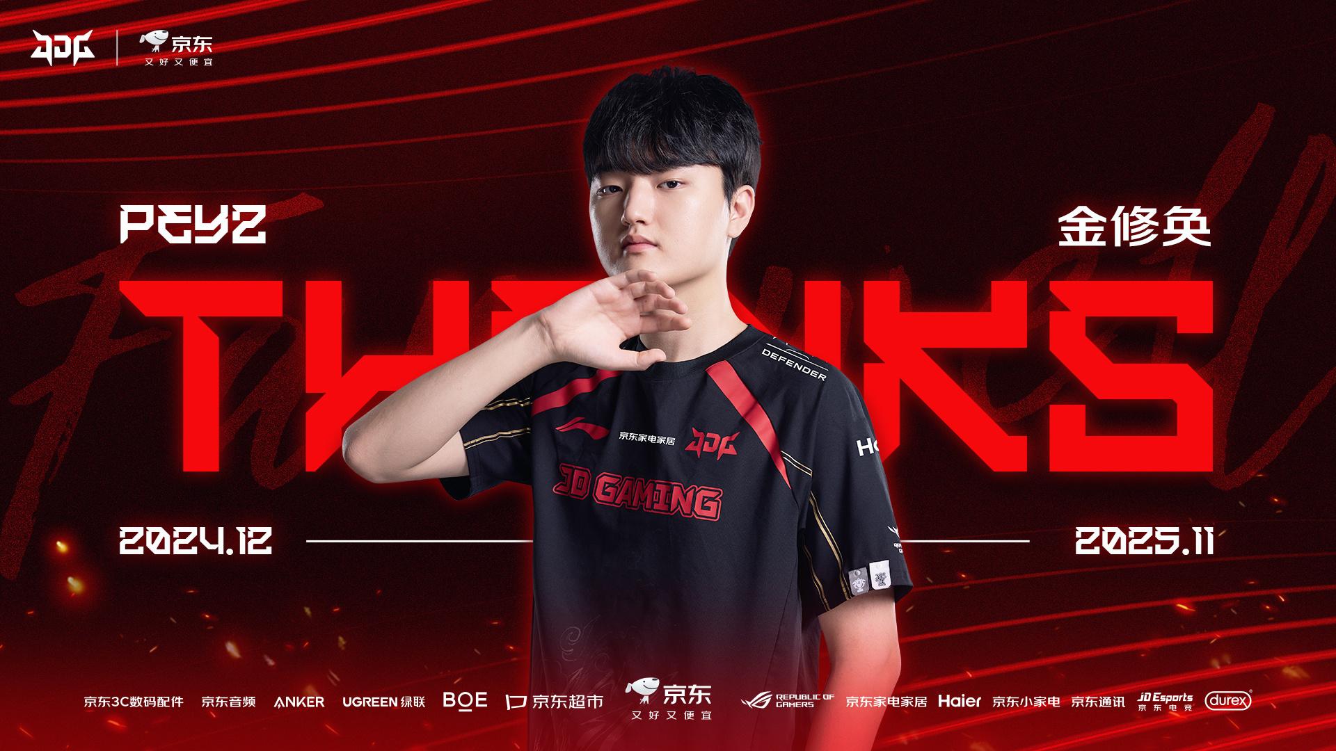 经选手与俱乐部双方友好协商,在充分尊重选手个人意愿的前提下,即日起JDG京东电子竞技俱乐部下路选手金修奂(ID:Peyz)正式断开连接。