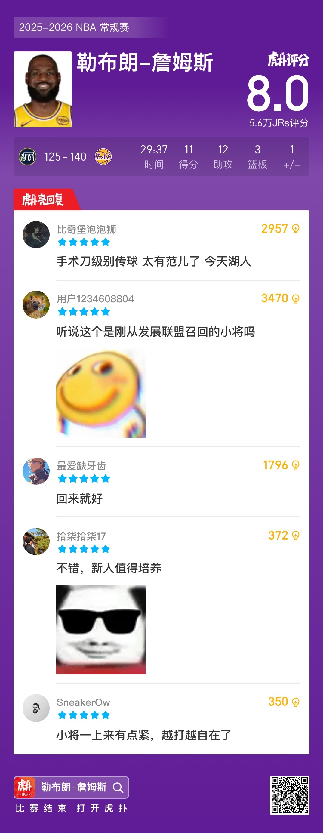 两双!詹姆斯复出首战,得到11分3篮板12助攻,成为历史单场助攻上双第二老球员今日NBA常规赛,湖人140-125战胜爵士。本场比赛,詹姆斯出战29分钟,投篮7中4,三分3中2得到11分3篮板12助攻1抢断。数据统计显示,目前40岁325天的詹姆斯成为NBA历史上常规赛单场助攻上双年龄第二大的球员,仅次于斯托克顿。