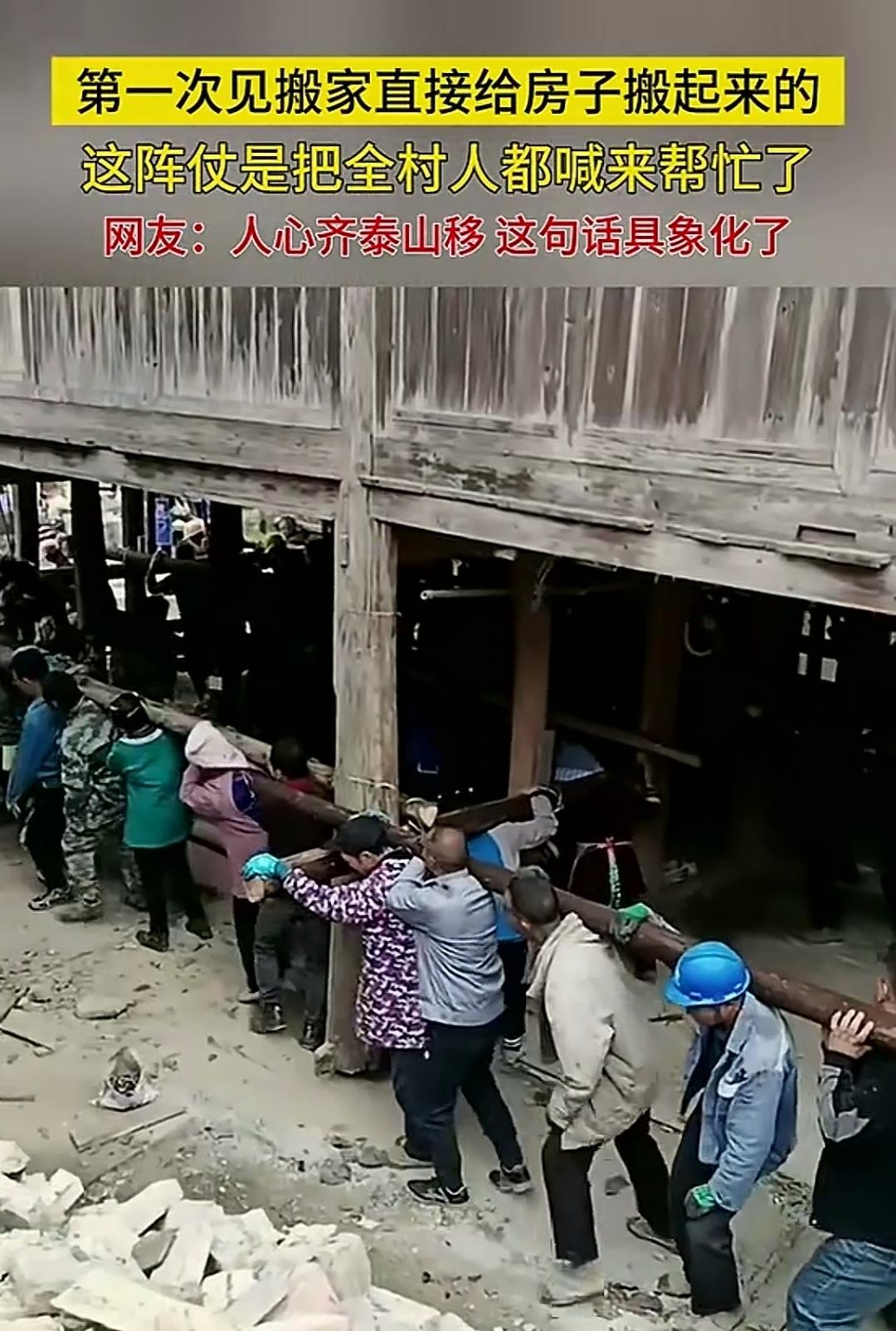 “人心齐,泰山移”,这话在此处有了具象体现。村子里但凡能抬重物的成年人都来抬那座老建筑了,他们齐心协力,硬是把这栋极具历史意义的老木房子往旁边挪动了不下10米。这老房子为何不拆掉,反倒要众人费力移走,其中缘由,恐怕只有参与抬房的人清楚。 瞧画面中这令人疑惑的场景,地点显示是贵州,在一列被锯开的老旧木房子下,有不少人正抬着扛子,显然他们是在移动这木房子。而另一边是这栋老房子的另一半,尚未开始挪动。 我十分好奇,为何要把这么老旧的木房子从中间锯开,只抬走一半,直接拆掉岂不是更省事?莫非这栋木房子有特殊意义?请人把一半移开一段距离,是为了在中间重新搭建一段,再整体修复,让它成为极具历史传统意义的古楼?