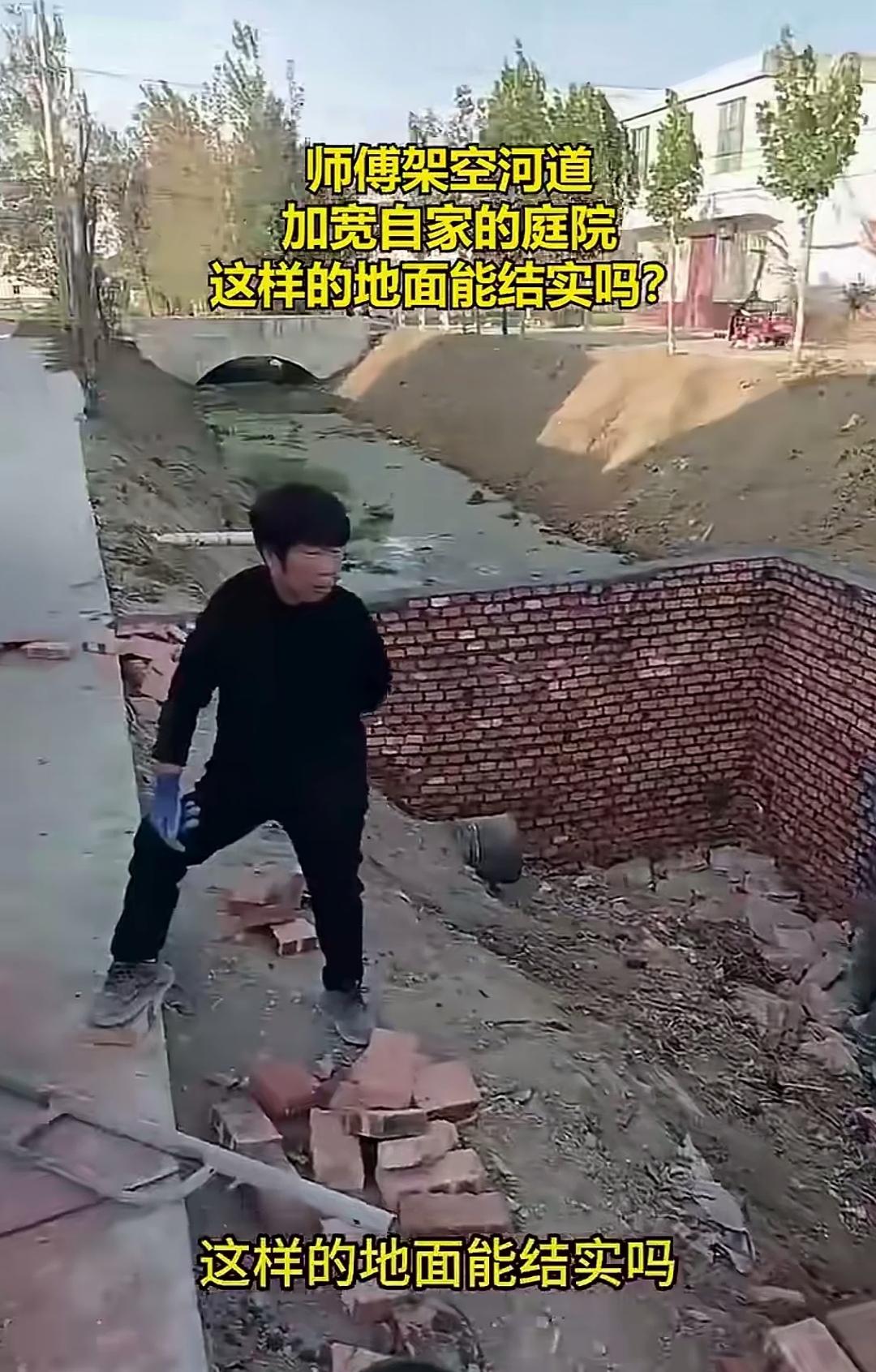 就因自家门前庭院不够宽敞,这户人家竟请人将河道架空,还把原先河边铺设的斜坡区域全用红砖砌了出来。显然,他们是想把河道边上的位置据为己有。殊不知,你们这么一弄,等雨水大的时候下水可就困难了!真不知这段画面要是被当地管事的瞧见,你们在这占用之事上的花销会不会付诸东流呢!