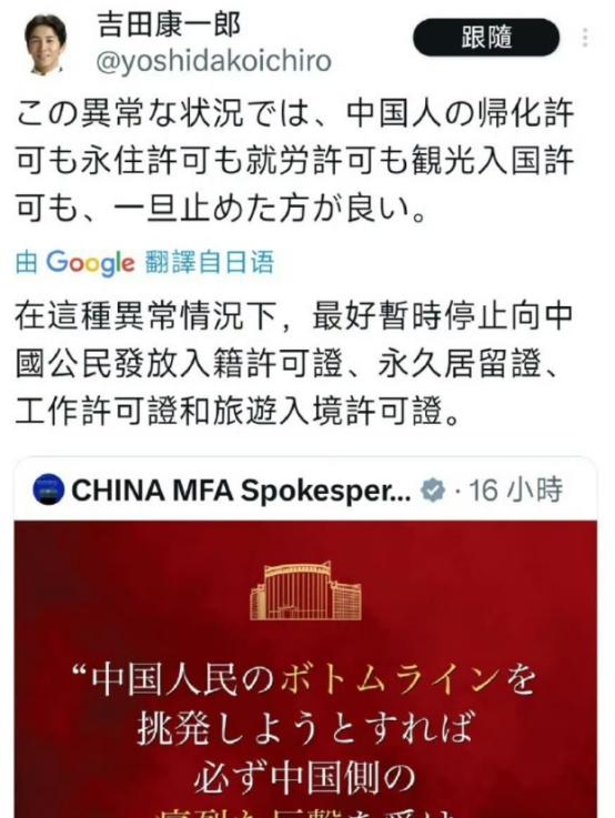 不知悔改!日本议员叫嚣“全面禁止中国人入境”,日网民:成事不足,败事有余。   最近日本右翼圈子里又蹦出个疯狂言论,直接把中日民间的讨论炸翻了天。事儿的起因也不复杂,前段时间中方因为日方一些不当做法升级了反制措施,本来就让不少日本右翼坐不住了,这群人不琢磨着怎么解决问题,反倒一门心思耍嘴皮子,想用狠话吓唬人。   其中有个叫吉田康一郎的右翼议员,最近在社交媒体上跳得最欢,公然宣称日本应该彻底停止给中国公民发放所有种类的签证,连永久居留权也得一刀切取消,说白了就是要全面禁止中国人入境。   这话刚一出来,右翼圈子里立刻一片叫好,不少极端网民跟着起哄,说什么“早就该这么干了”“中国人不配到日本”,说得好像自己多有骨气似的。   可稍微有点脑子的日本人都知道,这话说得有多荒唐,评论区里理智网民的怒斥声很快就盖过了右翼的叫嚣,有人直接回怼“成事不足败事有余”,更戳心窝子的一句是“最想日本死的根本不是中国等国家,反而是你们这些右翼”。   这话听着扎心,但仔细琢磨琢磨,还真没说错——这些人光顾着发泄情绪,压根没算过这笔禁止中国人入境的账,要是真照办了,日本得被坑成什么样。   先说说吉田康一郎嘴里“全面禁止”的对象,到底对日本意味着什么。可能很多人没概念,现在中国人去日本可不是简单的“游客串门”,而是实打实支撑着日本不少行业的命脉。   就拿旅游业来说,日本国家旅游局去年1月公布的数据显示,2024年访日外国游客总共3690万人,创了历史纪录,其中中国游客就有1438万多,占了快四成。   更关键的是消费能力,两岸三地的中国人在日本花了34855亿日元,折合成人民币得有1641亿,占到所有外国游客消费的42.8%——换句话说,外国游客给日本贡献的消费里,差不多一半是中国人掏的钱。   这些数字看着抽象,落到具体行业里就是真金白银的生意。东京银座、新宿那些高端免税店,还有三越伊势丹、高岛屋这些大百货公司,30%到40%的销售额都来自外国游客,而中国游客绝对是其中的主力。   再到京都、奈良这些热门旅游城市,路边的民宿、温泉酒店,还有东京迪士尼这种游乐园,平时中国游客占比就不低于20%,一到春节、国庆这种旺季,能占到40%以上。要是真把中国人挡在门外,这些店家不得集体喝西北风?   日本野村综合研究所的研究员算过一笔账,要是访日中国游客大幅减少,日本GDP得少0.36%,差不多是2.2万亿日元的损失,折成人民币就是1000多亿,这还没算上连带的就业问题。   就业这块更要命,中国游客直接间接带动的日本就业岗位就有60万个,覆盖了酒店、餐饮、零售、交通好几个行业。想想看,要是旅游业垮了,酒店服务员、餐厅厨师、商场导购、大巴司机这些人靠什么吃饭?   去年日本刚从疫情后的旅游业低谷爬出来,好不容易恢复到历史最好水平,这时候把最大的客源国给禁了,跟亲手把刚救活的产业再掐死有什么区别?   那些跟着吉田康一郎起哄的右翼网民,可能压根没意识到,自己骂着“中国人不配来”,说不定自己的亲戚朋友就在旅游相关行业上班,真禁了中国人,最先倒霉的就是他们自己人。     而且除了旅游,中日之间的经贸联系深到根本拆不开。中国社科院有份研究早就指出,日本对华直接投资都四十年了,从钢铁、机械到电子、零售,日本企业在华赚了多少利润,带动了多少日本本土的技术创新和出口,这些都是明摆着的。   就说资生堂、花王这些日本化妆品品牌,中国市场占了他们多大份额?还有丰田、本田这些车企,中国消费者买的每一辆车,都关系着日本本土工厂的工人饭碗。   要是因为吉田康一郎这种极端言论激化了矛盾,中方再出台点反制措施,受损的还不是日本企业和日本经济?   更有意思的是,吉田康一郎这种言论连日本政府都不敢接茬。毕竟政府层面很清楚,中日经贸是互利共赢的,真要搞“全面禁止”,纯属伤敌一千自损八千的蠢事。   可这些右翼政客不管这些,只要能博眼球、拉选票,什么出格的话都敢说,情绪一上头就把国家利益抛到脑后。难怪日本网民会说“最想日本死的是右翼”,这种只顾自己政治前途,不管普通民众死活、不顾国家经济安危的行为,跟害群之马没什么两样。   其实明眼人都看得出来,中方的反制从来都是事出有因,针对的是日方的不当做法,不是针对日本民众和日本企业。可这些右翼政客就是要混淆视听,把经贸问题政治化,用极端言论煽动对立。   现在越来越多的日本网民看明白了这一点,所以才会怒斥吉田康一郎“成事不足败事有余”。毕竟老百姓要的是安稳日子,是实实在在的收入,不是政客嘴里那些虚无缥缈的“强硬”口号