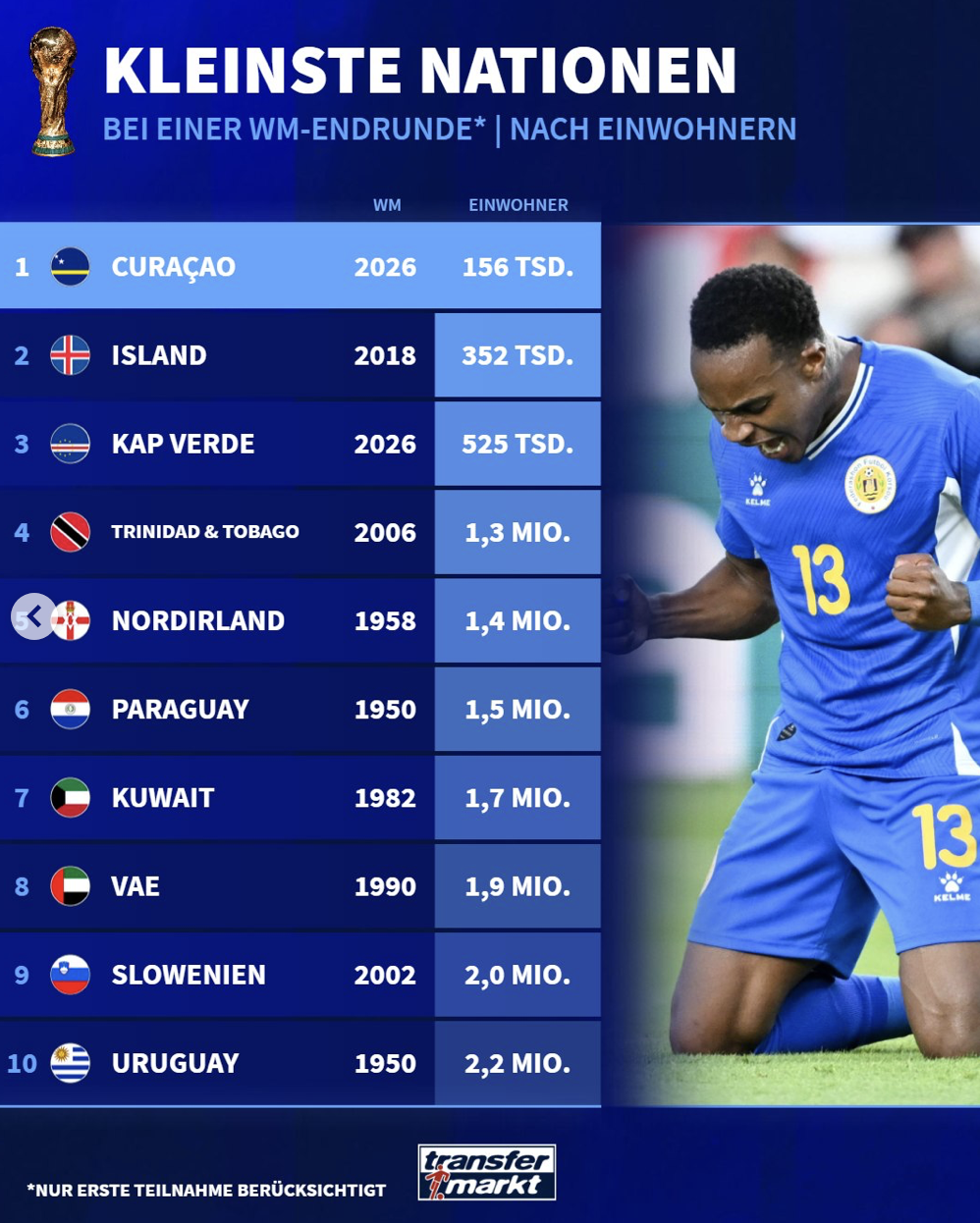 即将首次参加世界杯的加勒比海岛国库拉索以15.6万的总人口,超越冰岛的35.2万人,成为史上世界杯参赛国人口最少的国家。同样即将首次参加世界杯的佛得角以52.5万人排第三。