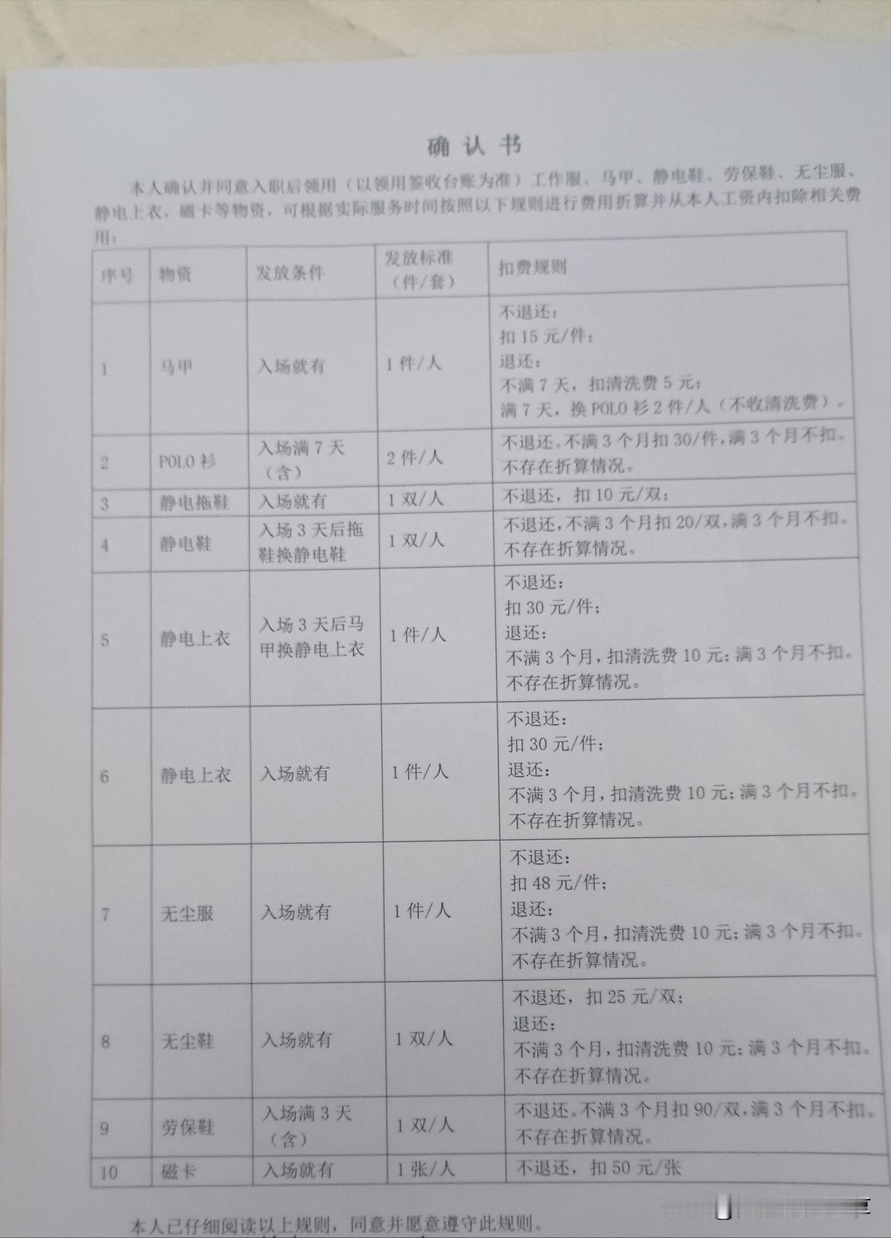 这几年经济压力大,工厂也开始精打细算了啊!今年在广州黄埔区某厂入职培训期间签了一份«确认书»,这个确认书是让你搞清楚工衣清洗费用的有关说明。每个新入职的员工先阅读再签字,怕你到时候不知道。 «确认书»详细罗列了无尘服、静电衣、静电鞋、POLO衫等工衣的清洗费用情况,简单的说如果你干不满三个月就离职的话根据时间长短都会扣相应的费用,你干的时间越长扣的钱越少,只有干满三个月且离职的时候把人家的工衣退回去才不会扣清洗费。除此以外厂牌不上交也会扣你50元工本费。这个确认书就就像法律条文一样。 这几年广州很多厂面临着很大的经济压力,有的厂扛不住都倒闭了。(这几年倒闭的厂有:光宝建兴、贝尔罗斯、闻泰科技、银城电子、中华意力……)。工厂面临的经济压力大了就会从员工身上一点一点的抠。以前免费的现在开始收费,以前发给员工的福利现在该取消的取消该减少的减少。有的奇葩厂连厂牌也收费了,一个厂牌15元,不得不说现在经济压力真的很大。