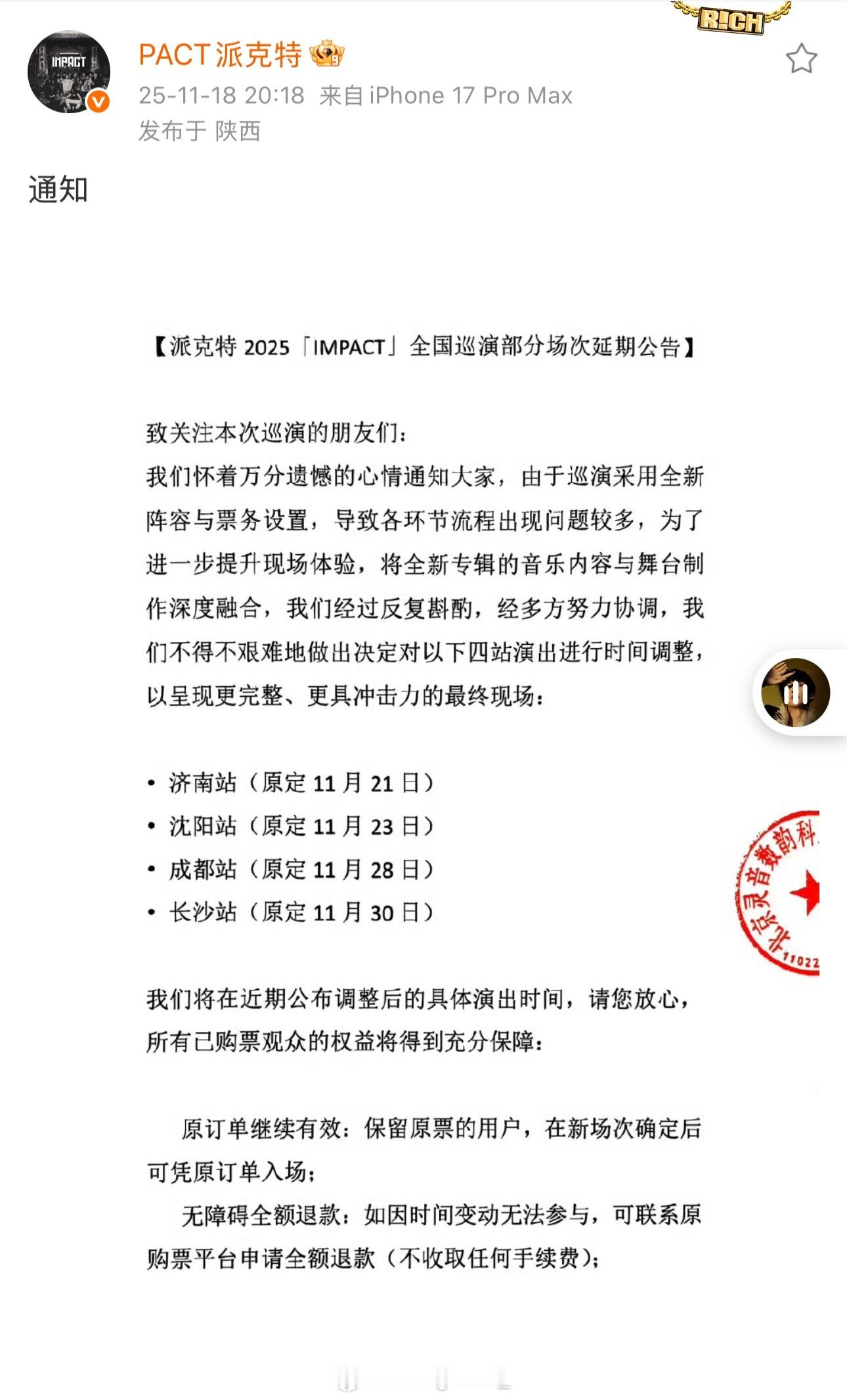 诚意拉满!派克特官宣巡演部分城市延期后,给出补偿措施:所有延期城市已购票的朋友