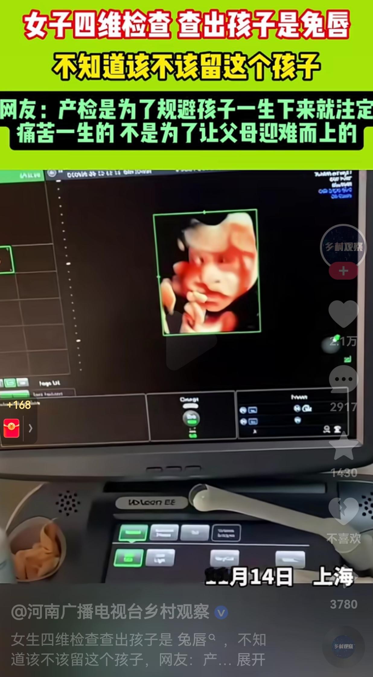 如果是你,你会怎么做?上海一女子做四维检查的时候,查出孩子是兔唇。 当孕妈妈知
