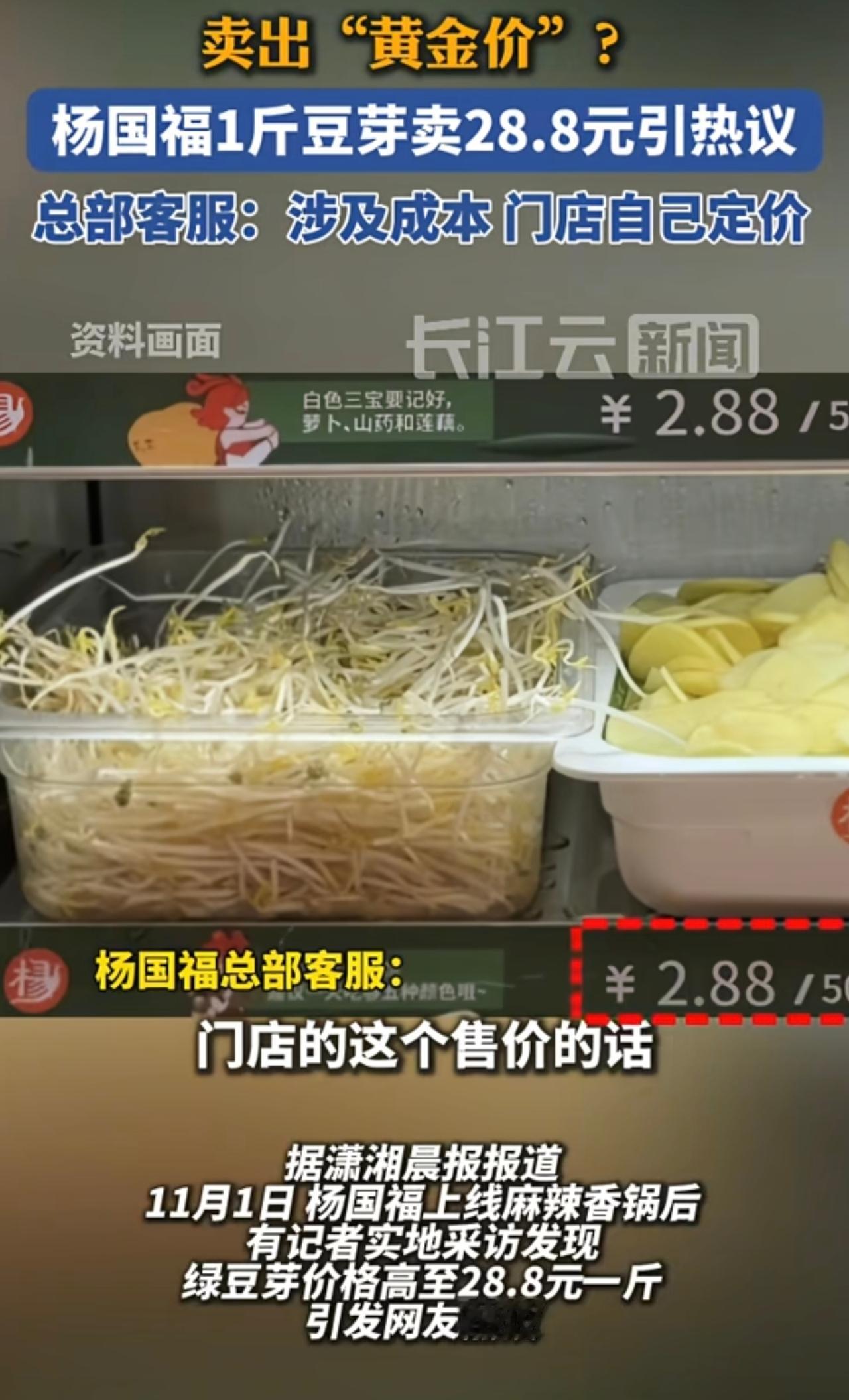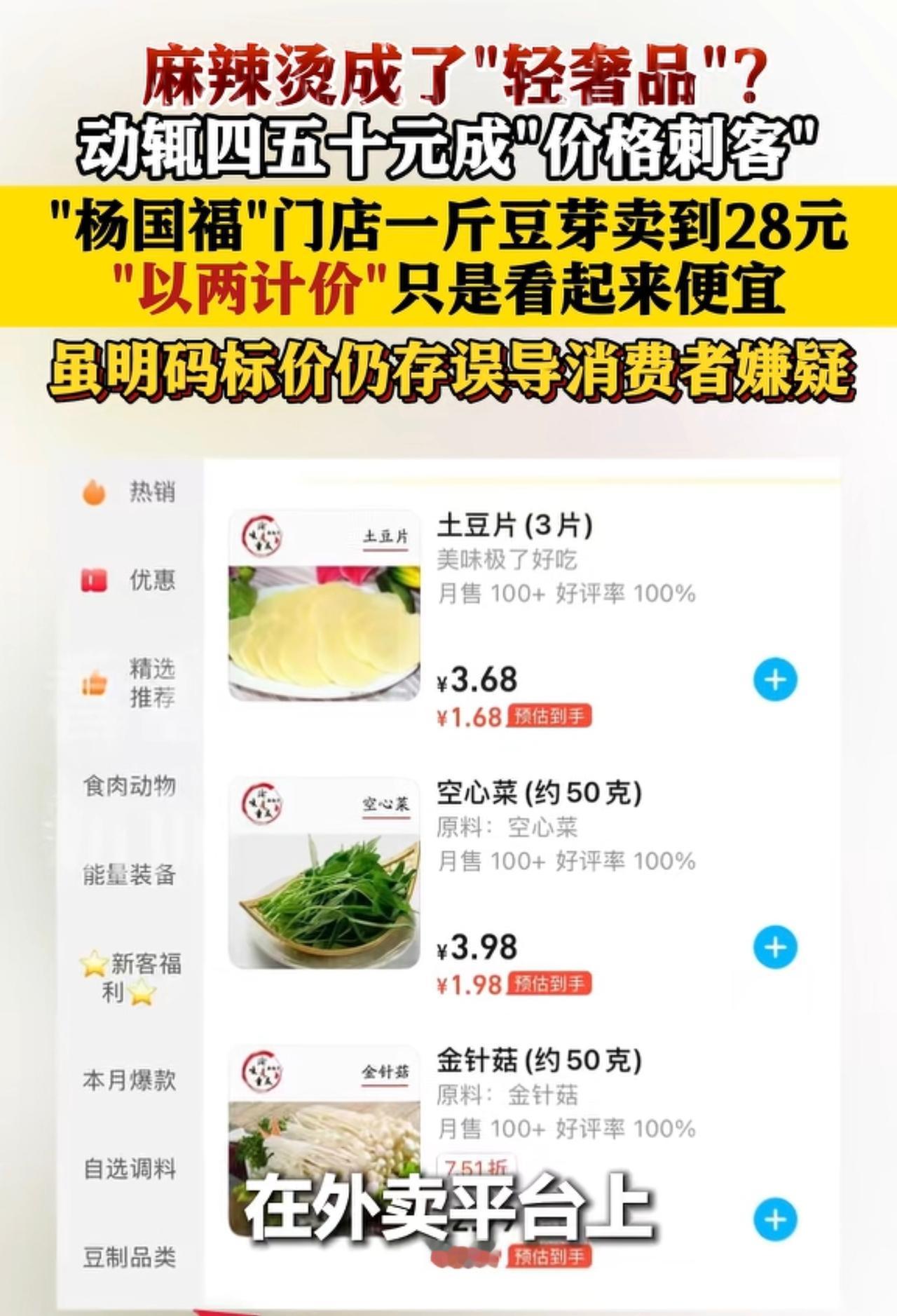 终于有人算明白账了,其实不仅仅是杨国福,很多商家都是在玩文字游戏。很多菜价都是按克去卖,单位越小菜价越低,很多时候没人看单价多少,都会看总价合不合适。豆芽看着的确很便宜2.88元50克(一两),又有几个人知道市场上一斤才几块钱。但凡经常去买菜的估计都会吓一跳,摇身一变身价翻了多少倍,原来不是菜贵了,是换个方式卖了而已。