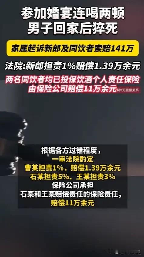 内蒙古,男子参加婚宴期间,喝了几杯白酒。婚宴结束后,他还不尽兴,又联系朋友去吃烧烤,还喝了少量的啤酒。谁能料到,男子回家后,当晚发生心源性猝死。男子家属悲痛之余,把新郎官以及一起喝酒的朋友告上法庭,索赔141万。新郎:正常办个婚宴,怎么还摊上了官司?一起喝酒的朋友更是委屈,他们没有强行敬酒和劝酒,男子喝酒并不多,回家的时候好好的,猝死了凭什么要他们赔偿?法院审理后,作出的判决让他们彻底傻眼。 这事儿发生在2024年7月6日晚,内蒙古准格尔旗。拓先生受邀参加好友曹先生的婚宴夜场,席间和大家一起喝了白酒。婚宴结束后,他觉得还没尽兴,又约上朋友石先生,打电话叫来王先生一起吃烧烤。烧烤摊上,王先生点了六瓶啤酒,拓先生稍微喝了一点就先回家了。 谁能想到,第二天凌晨,拓先生在家中被发现身体异常,急救人员赶到时已经来不及了。诊断结果是心源性猝死,好好一个人说没就没了。家属翻看他去年的体检记录,明明显示心脏没问题,这更让他们无法接受。 新郎曹先生觉得特别冤。自己大喜的日子,请朋友来喝喜酒是再正常不过的事。婚宴上没人劝酒逼酒,大家都是随意喝的,怎么最后会变成这样?一起喝酒的石先生和王先生也委屈,他们根本没逼酒,拓先生回家时看起来也挺正常。 法院仔细调查了全程。婚宴上大家确实没有劝酒行为,但石先生是两场酒局的参与者,明明看到拓先生在婚宴上喝了四杯半白酒,烧烤时却没劝阻他继续喝啤酒。王先生虽然没参加婚宴,但知道拓先生刚喝完酒还点啤酒,也有疏忽。 最终的判决出乎不少人意料。拓先生自己承担91%的责任,作为完全民事行为能力人,他该知道自己的身体状况。新郎曹先生作为组织者担责1%,赔偿约1.4万元;石先生担责5%,赔6.9万元;王先生担责3%,赔4.1万元。石和王投保了“安心酒保”保险,这部分赔偿由保险公司承担。 这样的判决背后是法律对共同饮酒人“注意义务”的认定。虽然不劝酒是底线,但看到朋友连续饮酒,简单提醒一句“少喝点”其实是朋友间应有的关心。这种提醒不是多管闲事,而是真正的照顾。 婚宴本是高兴事,谁都不想闹出悲剧。喝酒助兴没问题,关键是要量力而行。作为朋友,看到别人喝多了,递杯热水、帮忙叫个车,这些小事可能就能避免一场意外。 各位读者你们怎么看?欢迎在评论区讨论。