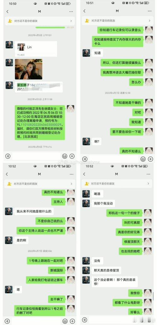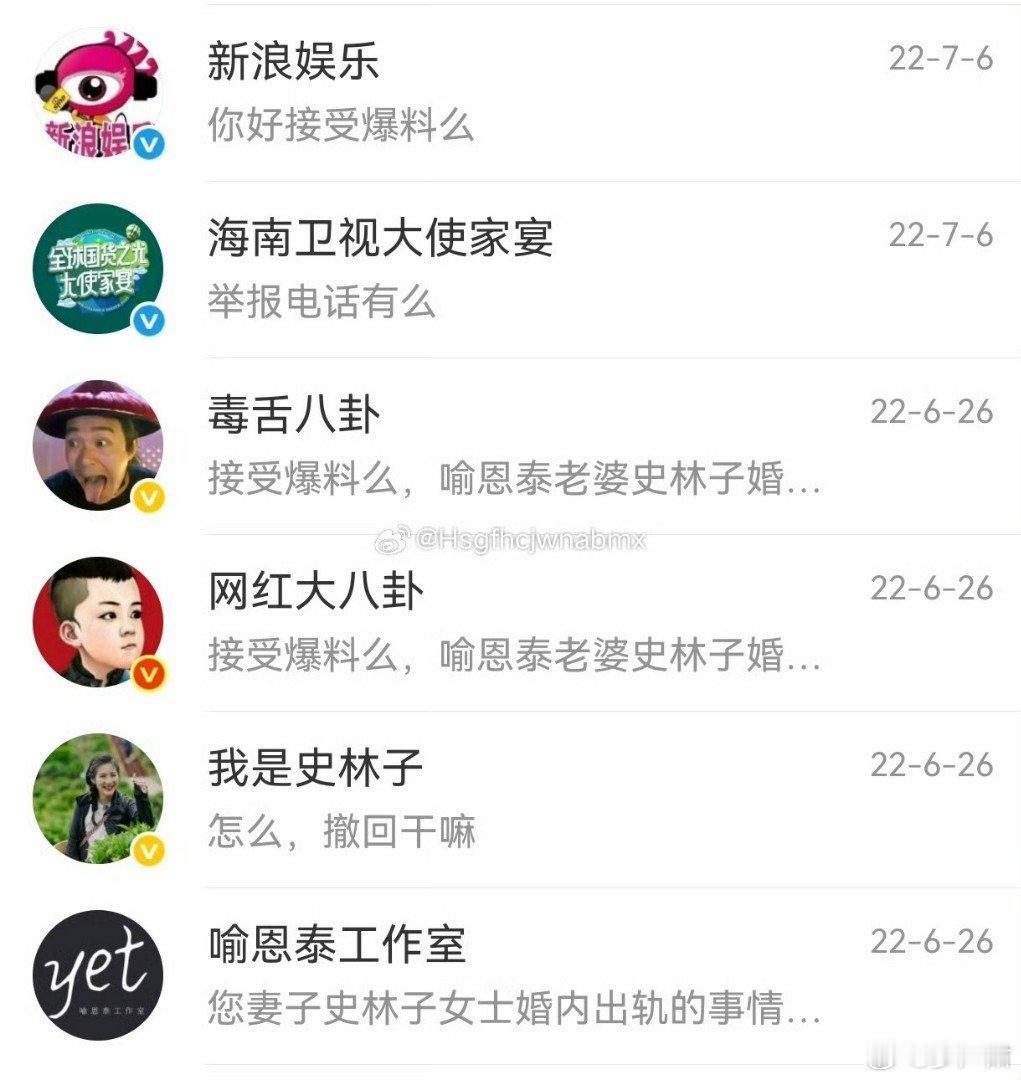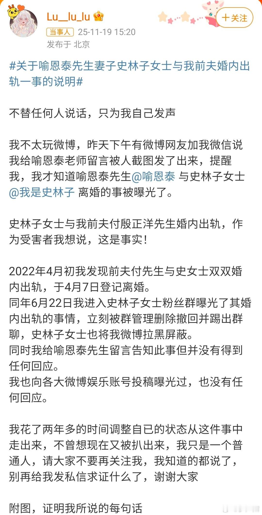 史林子出轨对象付殷正洋前妻徐女士发文,现已删除。徐女士曾于2022年在喻恩泰微博下留言称史林子出轨。今日徐女士发长微博,称2022年4月发现丈夫出轨史林子,4月7日登记离婚,6月她进入史林子粉丝群曝光此事,被删除信息并踢出粉丝群,史林子将她微博拉黑。徐女士是在行车记录仪里发现前夫与史林子出轨证据,并与前夫微信对质。自己曾给媒体及自媒体留言爆料没有回音。