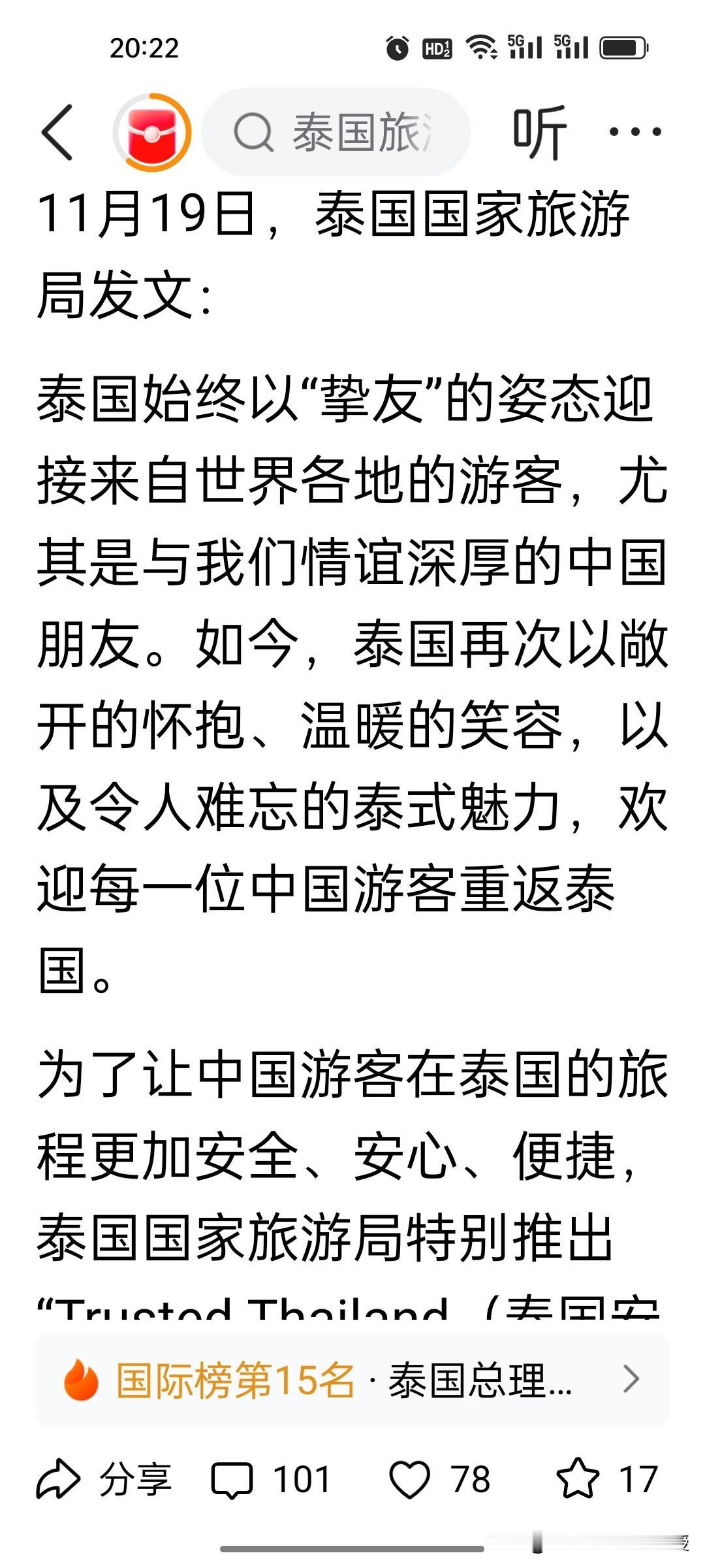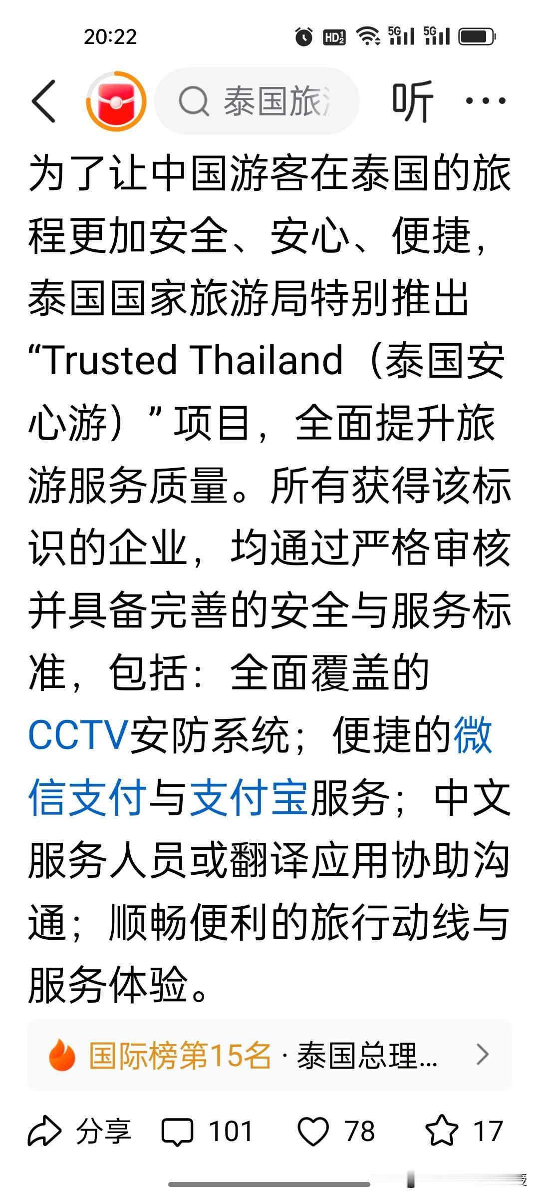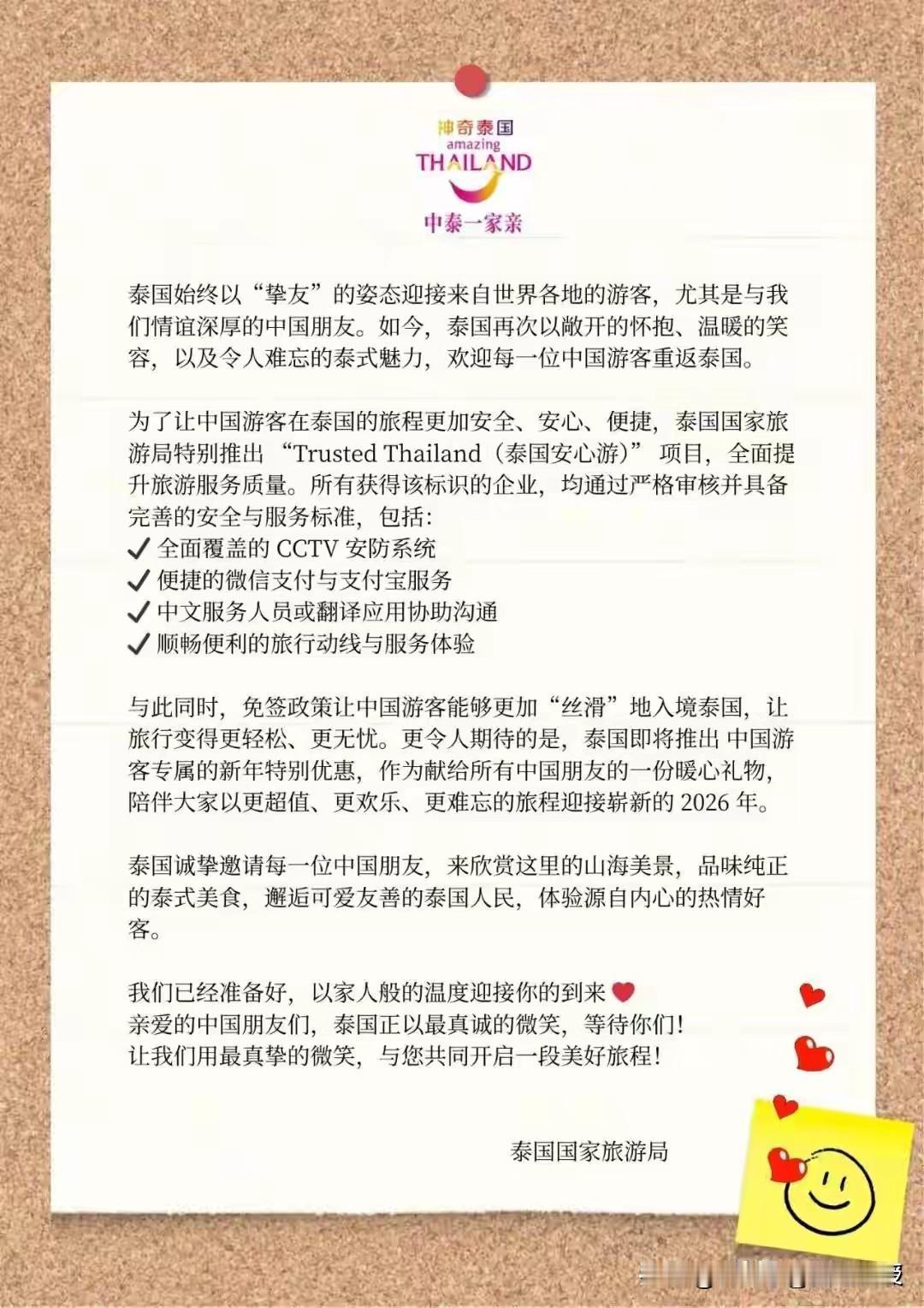泰国真的是使劲浑身解数想要抓住这一波中国游客流量啊!外交部、文旅部发出“避免前往日本”的通知后,今天,泰国国家旅游局发文了,泰国推出了“安心游”项目,可谓是细致入微,安防系统,微信支付宝支付,一应俱全,称中国游客为“挚友”。 泰国太需要承接本要赴日旅游的中国游客这波流量了,泰国没有中国游客,旅游业一直不振,看图9,但是很多网友对东南亚国家旅游还是心有余悸。