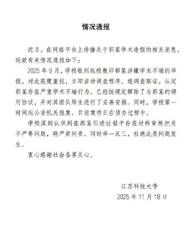 “高中学历当博导”:江苏科大已报案,央视一锤定音,多人受牵连 江苏科技大学连夜针对“高中学历郭某当博导”事件,发布了情况说明,称经过调查,发现郭某确实存在学术不端行为。 对此,学校已经解聘了郭某,并且已经报案! 学校发布情况说明之后,央视新闻也转发了此通报,郭某“首席科学家”、“博士生导师”等都是假的。 这也一锤定音了江苏科技大学在人才引进方面,存在严重的疏漏。 那么,郭某是怎么被引进入江苏科技大学的呢? 据公开资料显示,郭某是1994年高考状元考入的西安科技大学材料专业,后去日本留学。 2023年以出国留学人才引进入了江苏科技大学,直到2025年9月份,郭某竟然只是高中生。 令所有人没想到的人,这样一个“骗子”,用一份假的简历,2年前被高层次人才引进,不仅有300万的安家费,还有140万一年的年薪,更甚至手里面还有接近500万的科研经费。 郭某这个骗子在学校待了2年,才发现只有高中学历。 所谓的留学生,是假的;所谓的高考状元,是假的;所谓的国际论文,竟然是冒领同名的其他人的,假的。 让看到郭某网传的“简历”的人,直呼“匪夷所思”,这世界果然是个巨大的草台班子…… 据知情人透露,郭某是猎头公司推荐过去的,公司没有做背调,学校也没做背调,这下领导也要担责了。 如今,涉事学校江苏科技大学不仅解聘了当事人郭某,还直接报警了。 很明显,学校的做法,就想追回给郭某的“钱”,也想让这个骗子付出应有的法律责任。 然而,多个官媒发文追问,如大象新闻《高中生博导闹剧,谁在装睡》,质疑当地及学校人才引进的机制,及其中涉及的相关人员是否有违规行为呢? 这次江苏科技大学直接闹了教育圈今年最大的一个笑话,表面看是闹剧,深层次又反映了教育圈存在学术造假的问题。 目前,郭某已经被帽子叔叔带走,帽子叔叔已经介入调查,我们静待后续的调查结果。 这件事也给所有高校一个警醒,对此,您觉得呢?