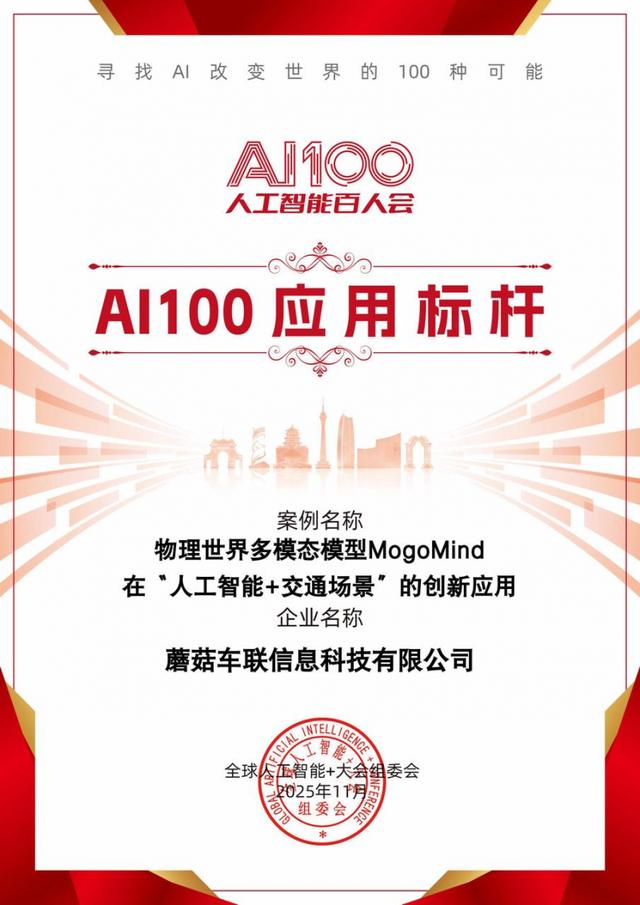 11月15日至17日,以“AI下一个十年:场景驱动×新质引擎”为主题的2025“人工智能+”大会在北京举办,图灵奖得主、中国科学院院士、清华大学交叉信息研究院及人工智能学院院长姚期智亦参加了盛会。在大会主论坛上,中国人工智能百人会正式发布“AI100应用标杆”榜单,蘑菇车联(MOGOX)凭借MogoMind大模型在“人工智能+交通”的创新应用成果,入选“‘人工智能+’产业发展”应用标杆。