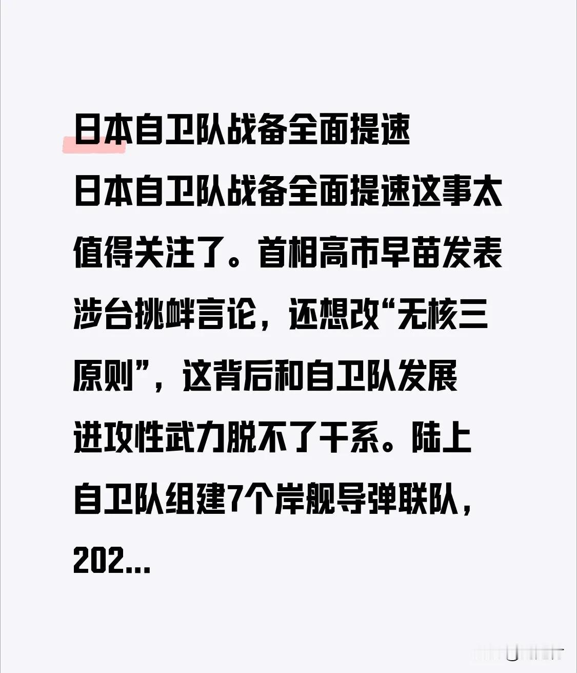 日本自卫队战备全面提速 日本自卫队战备全面提速,此事值得高度关注。首相高市早苗发表涉台挑衅言论,还妄图修改“无核三原则”,这与自卫队发展进攻性武力密切相关。 陆上自卫队组建7个岸舰导弹联队,2026年将换装射程1000公里的增程型12式岸舰导弹,还展示国产HVGP新型导弹,引进17架“鱼鹰”运输机增强夺岛战力。海上自卫队强化“对陆攻击能力”,改造航母以搭载F - 35B进行远海作战。航空自卫队加紧训练、列装战机。日本还计划在2032年前部署1500枚远程导弹、扩建弹药库。这一系列举动严重违背“专守防卫”原则,进攻姿态明显,周边国家需保持警惕! 日本军事挑衅 日本军事实力 日本海域军演 日本涉台战略 日本军事威胁 防卫省自卫队