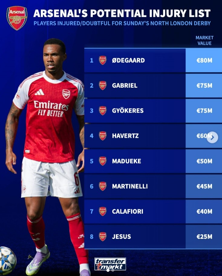 直播吧11月19日讯英超北伦敦德比不久将会打响,德转盘点了阿森纳队内因伤无法出战或出战成疑的球员名单以及身价,具体如下: