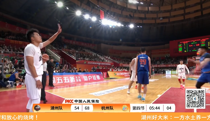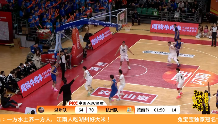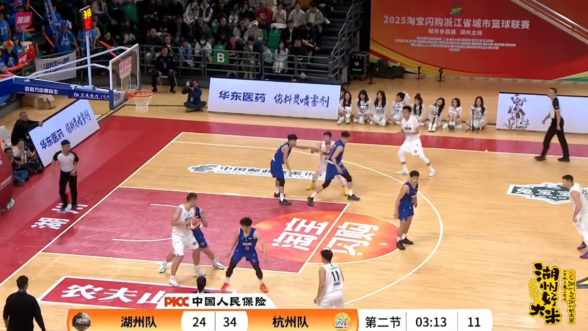 第二节,29比39,湖州队落后10分。上半场,杭州队主要赢在了篮板球。