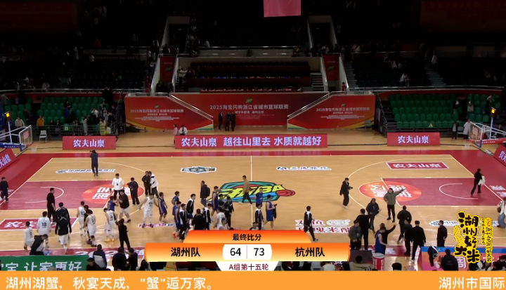 第四节,湖州队反击,比分一度缩小到6分,最终64比73,杭州队胜。