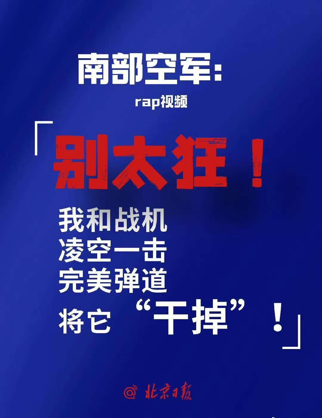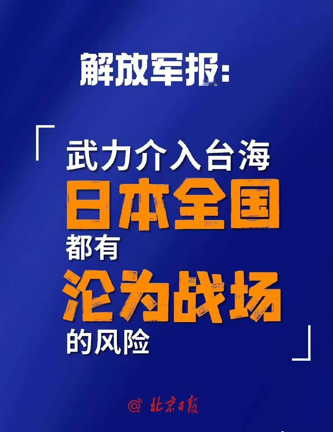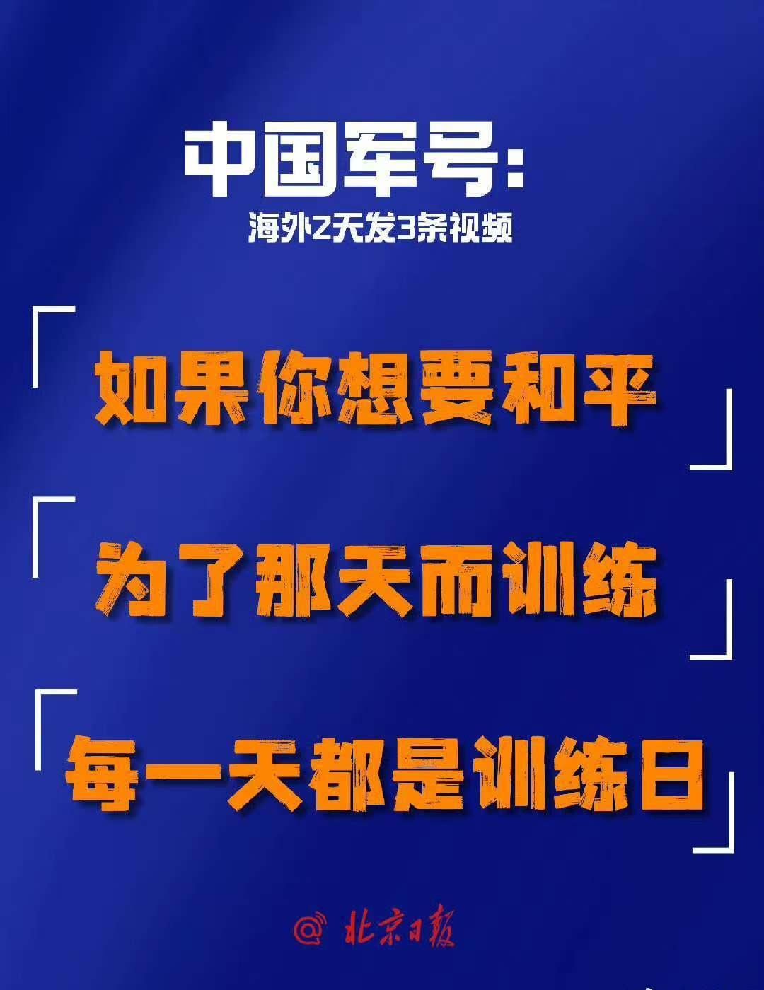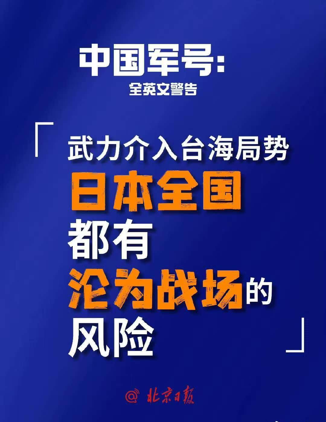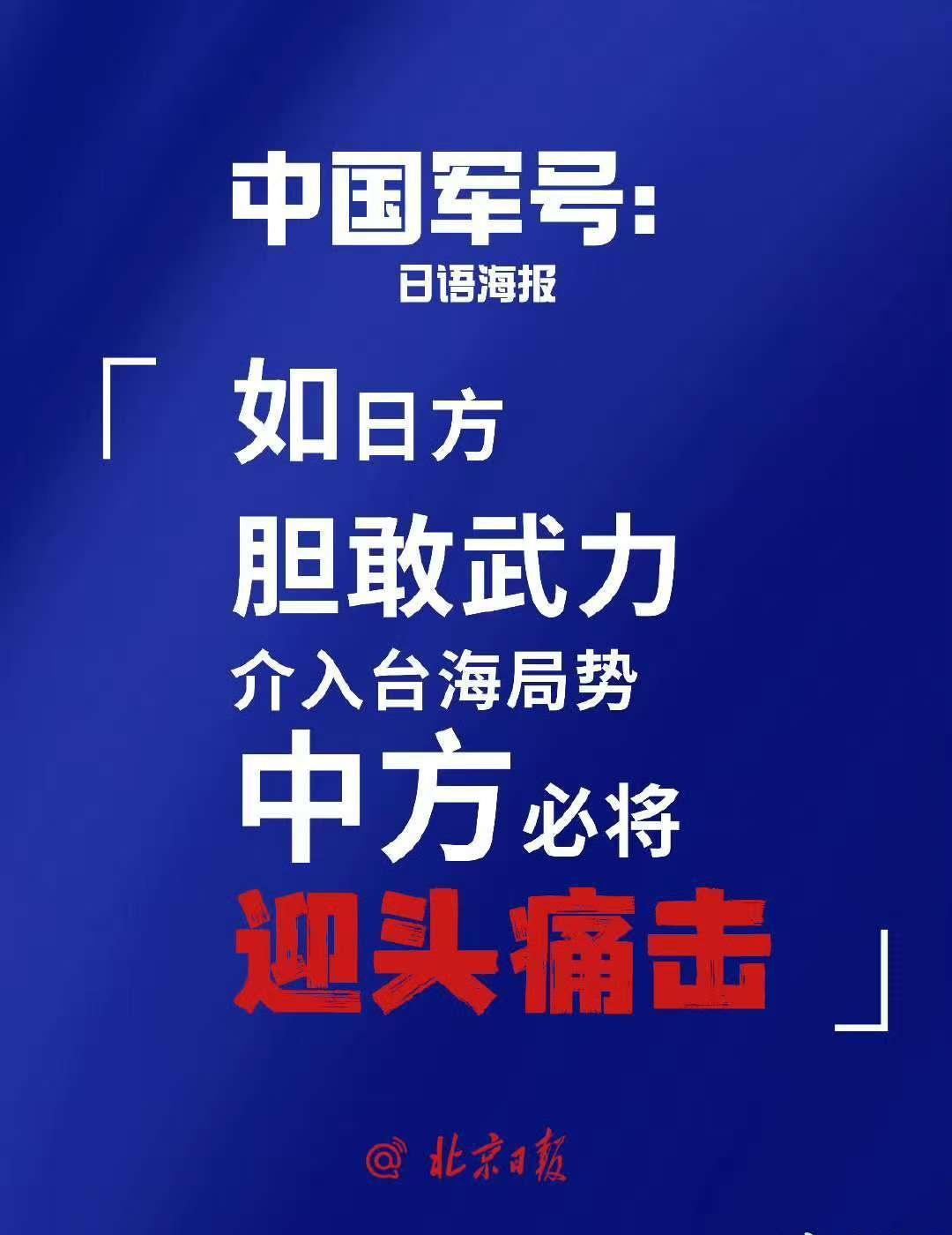国防部:日方若胆敢铤而走险,必将碰得头破血流。 解放军报:武力介入台海,日本全国都有沦为战场的风险。 中国军号全英文警告:武力介入台海局势,日本全国都有沦为战场的风险。 中国军号发布日语海报:如日方胆敢武力介入台海局势,中方必将迎头痛击! 中国军号在海外2天发3条视频,配文:“如果你想要和平”“为了那天而训练”“每一天都是训练日”。 南部空军发布rap《别太狂》:我和战机凌空一击,完美弹道,将它“干掉”。 中部空军:枪已上膛剑已出鞘,我们时刻准备打胜仗! 东部战区发布重磅视频《若一去不回》《归程》,配文:步履不停!归程可期! @北京日报