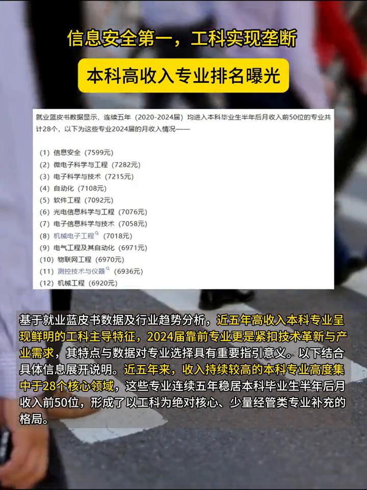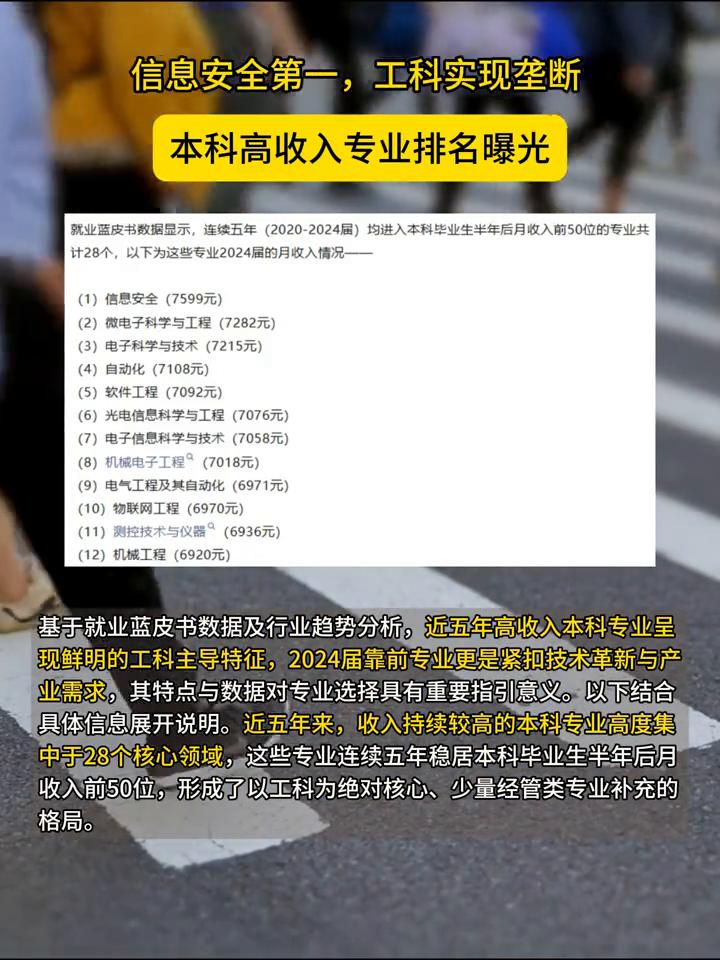 信息安全第一,工科实现垄断,本科高收入专业排名曝光。 就业蓝皮书数据显示,连续五年(2020-2024届)均进入本科毕业生半年后月收入前50位的专业共计28个,以下为这些专业2024属的月收入情况: ·(1)微电子科学与工程(7282元)。 ·(2)光电信息科学与工程(7076元)。 ·(3)电气工程及其自动化(6971元)。 ·(4)电气工程及其自动化(6971元)。 ·(5)电气工程及其自动化(6971元)。 ·(6)光电信息科学与工程(7076元)。 ·(7)电子信息科学与技术(7058元)。 ·(8)电气工程及其自动化(6971元)。 ·(9)测控技术与仪器(6936元)。 基于就业蓝皮书数据及行业趋势分析,近五年高收入本科专业呈现鲜明的工科主导特征,2024届靠前专业更是紧扣技术革新与产业需求,其特点与数据对专业选择具有重要指引意义。以下结合具体信息展开说明。 近五年来,收入持续较高的本科专业高度集中于28个核心领域,这些专业连续五年稳居本科毕业生半年后月收入前50位,形成了以工科为绝对核心、少量经管类专业补充的格局。 从2024届本科毕业生月收入排名靠前的专业来看,前10位专业月收入均突破7000元,最高的信息安全达到7599元,显著高于全国本科平均水平(6199元),且全部为工学类专业,呈现出鲜明的技术密集型特征。这些专业的核心特点首先是技术壁垒高,多为交叉融合学科,如信息安全融合计算机、通信、数学、法律等多领域知识。聚焦网络防护与数据加密,近五年人才缺口年均增速达30%,成为数字化时代的"安全卫士"。 微电子科学与工程作为芯片研发的核心专业,深耕半导体器件与集成电路技术,因我国芯片自给率不足20%,人才缺口达30万,行业高壁造就了7282元的高薪水平。