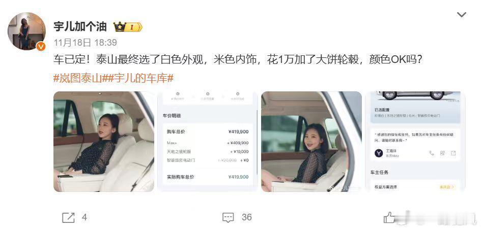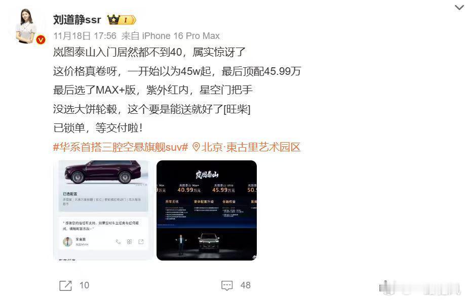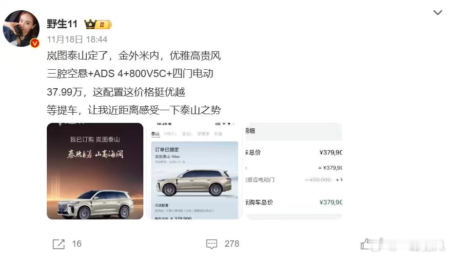 大 V 热捧的岚图泰山,究竟有何魅力?作为一名汽车爱好者,最近被岚图泰山的热度彻底刷屏了!就连各路名人大 V 也纷纷晒单,今天我们就一起来看看这款车型到底有什么魔力吧~ 直接晒出了订单,并表示等不及拍完戏后开着岚图泰山去欣赏祖国的大好河山; 11 则选择了岚图泰山 Max 版本,直言 '37.99 万的价格和配置太超值了'!三腔空气悬挂 + ADS 4+800V5C + 四门灵动设计,光看这些配置就知道这是一款起步即顶配的车型,难怪大 V 们都不由自主地入手了。 选择了白色外观搭配米色内饰,还额外花费 1 万元升级了大饼轮毂,不得不说,这种审美真的非常在线,无论哪种配色,岚图泰山都能展现出其独特的魅力!看了这么多名人大 V 的晒单,我终于明白了岚图泰山为何如此火爆 —— 顶级配置、高颜值以及诚意满满的价格,无论是家庭用车还是追求科技感的车友,都能在这款车型中找到自己的心动点!你最钟意哪个配置呢?欢迎在评论区分享你的看法~岚图泰山