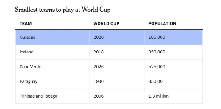 直播吧11月19日讯2026年世界杯,佛得角和库拉索首次进入世界杯,他们的人口数量也相当少,据TA统计,库拉索及佛得角进入参加世界杯最少人口排名前5,库拉索最少。