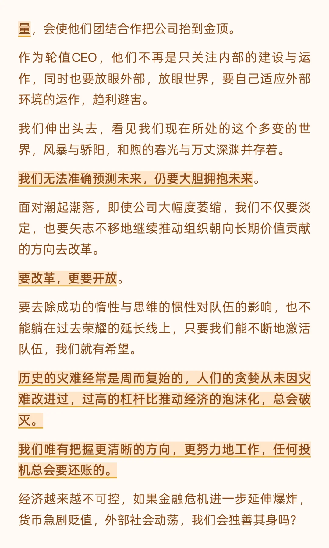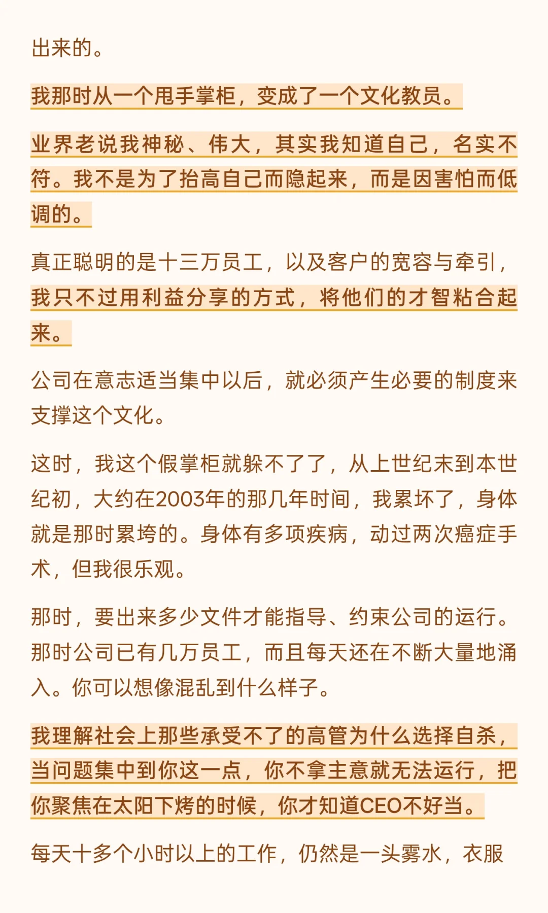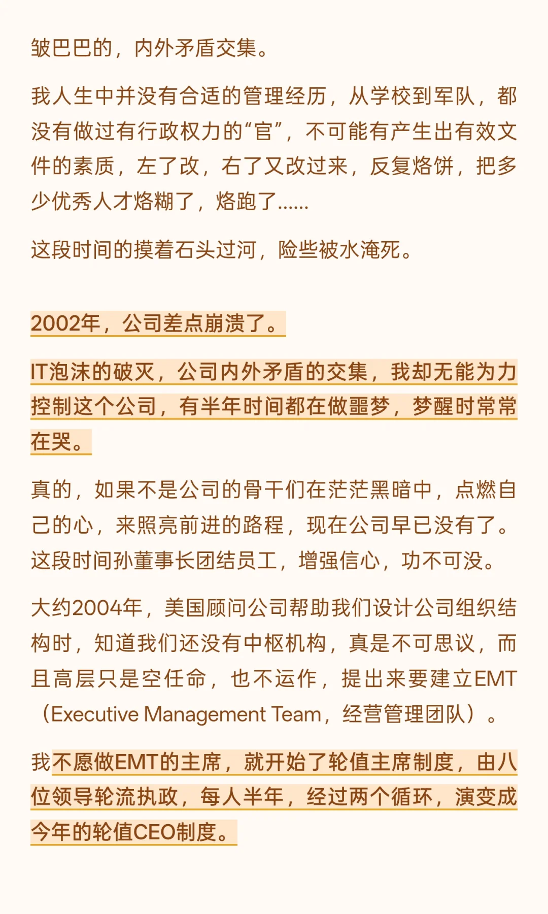 任正非:“2002年,公司差点崩溃了。IT泡沫的破灭,公司内外矛盾的交集,我却无能为力控制这个公司,有半年时间都在做噩梦,梦醒时常常在哭。真的,如果不是公司的骨干们在茫茫黑暗中,点燃自己的心,来照亮前进的路程,现在公司早已没有了。”