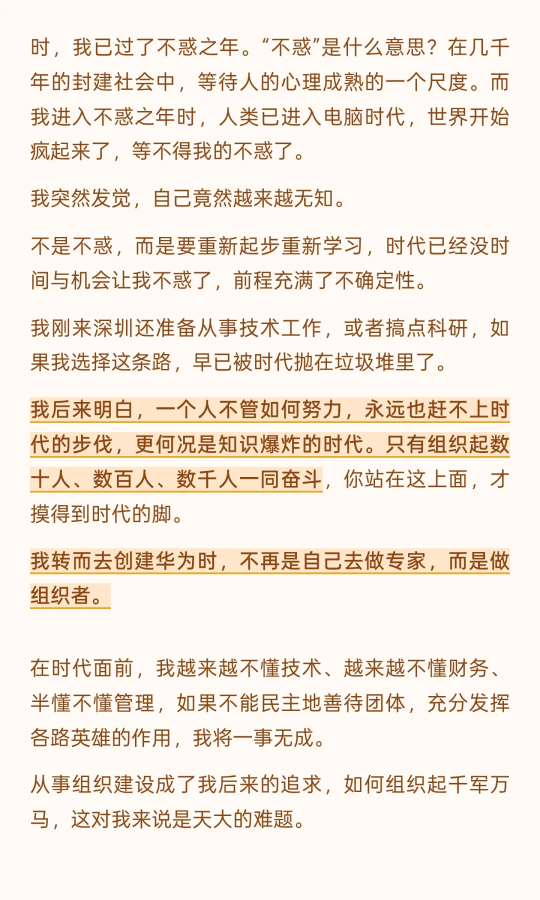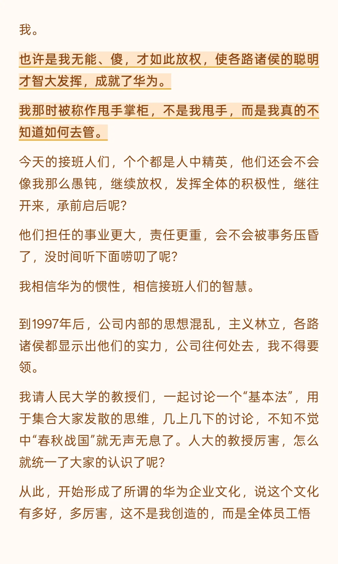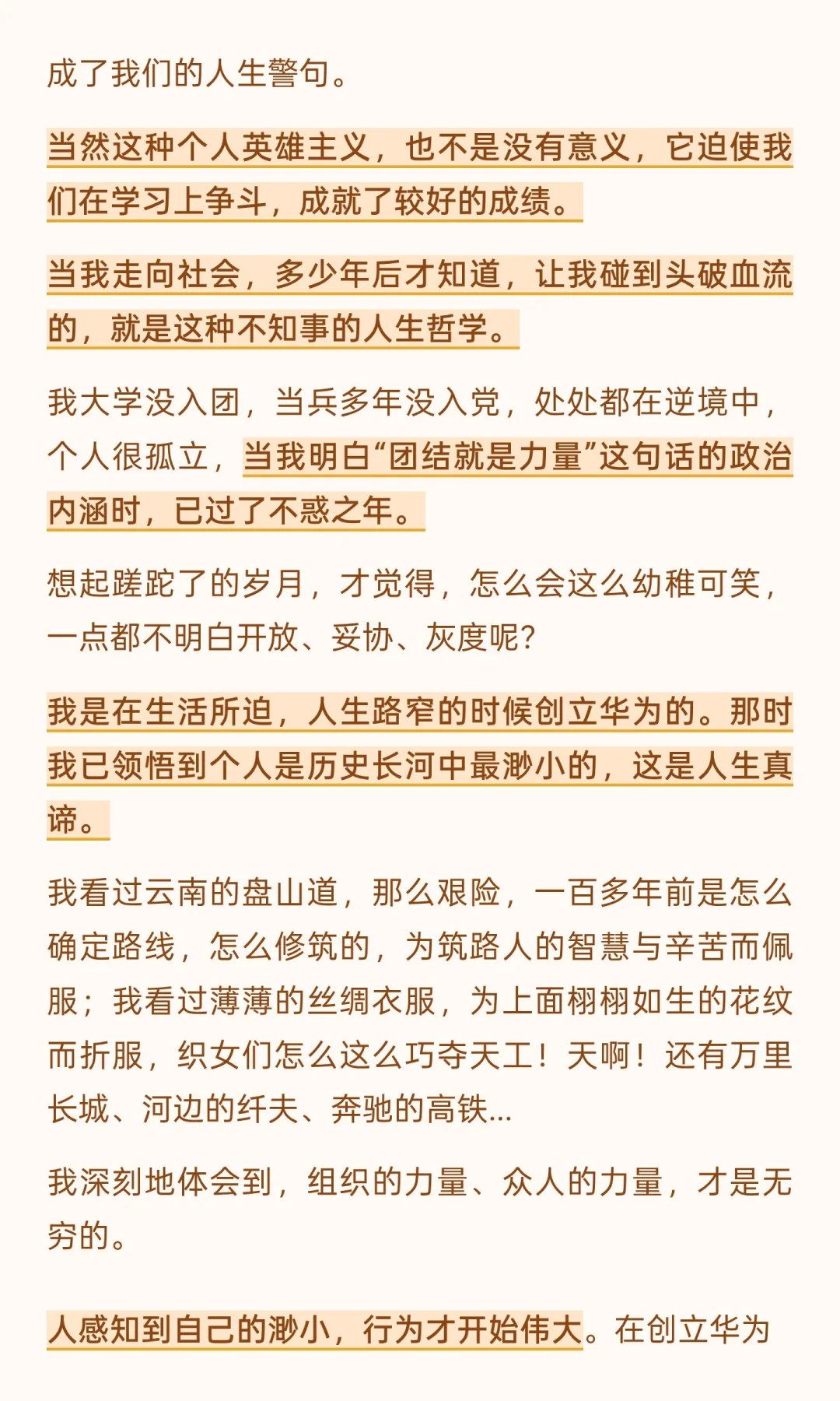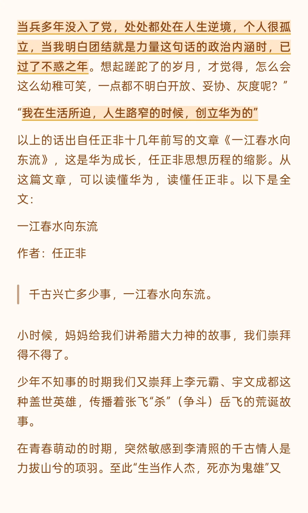以上的话出自任正非十几年前写的文章《一江春水向东流》,这是华为成长,任正非思想历程的缩影。从这篇文章,可以读懂华为,读懂任正非。
