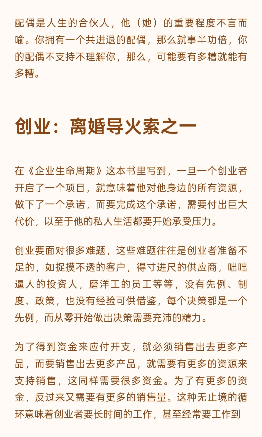 配偶是人生的合伙人,他(她)的重要程度不言而喻。你拥有一个共进退的配偶,那么就事半功倍,你的配偶不支持不理解你,那么,可能要有多糟就能有多糟。