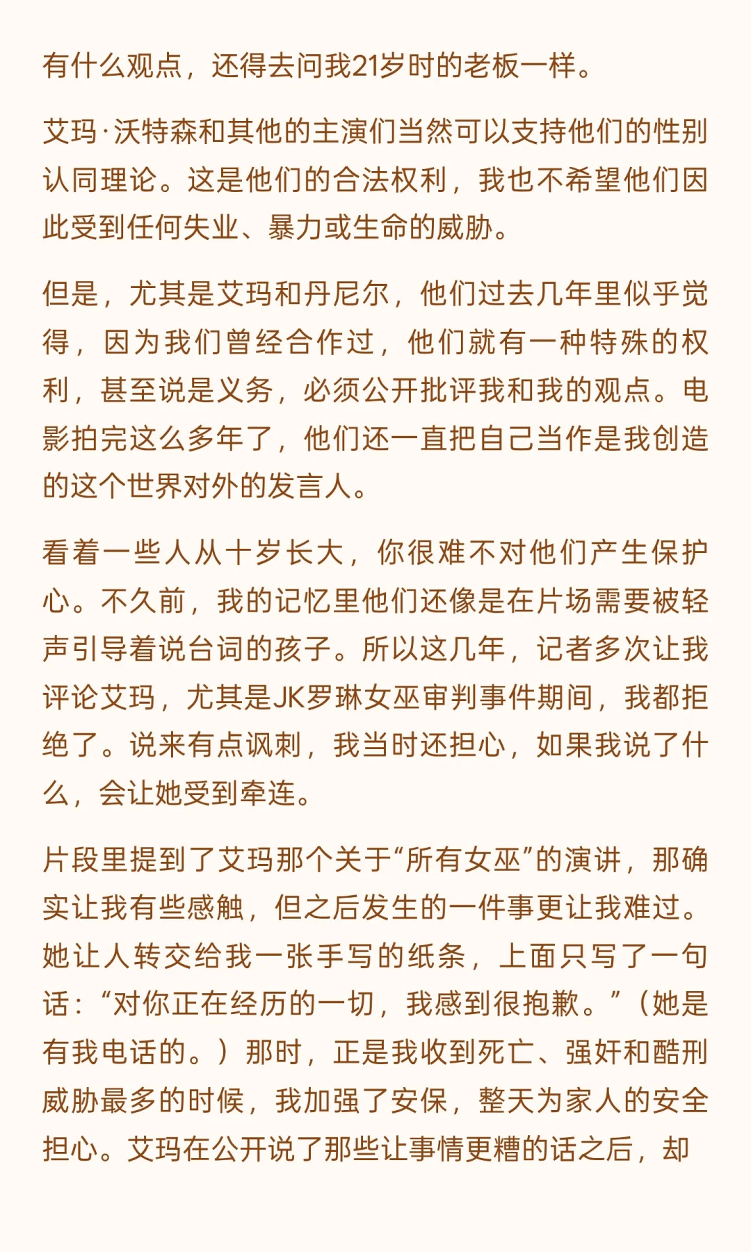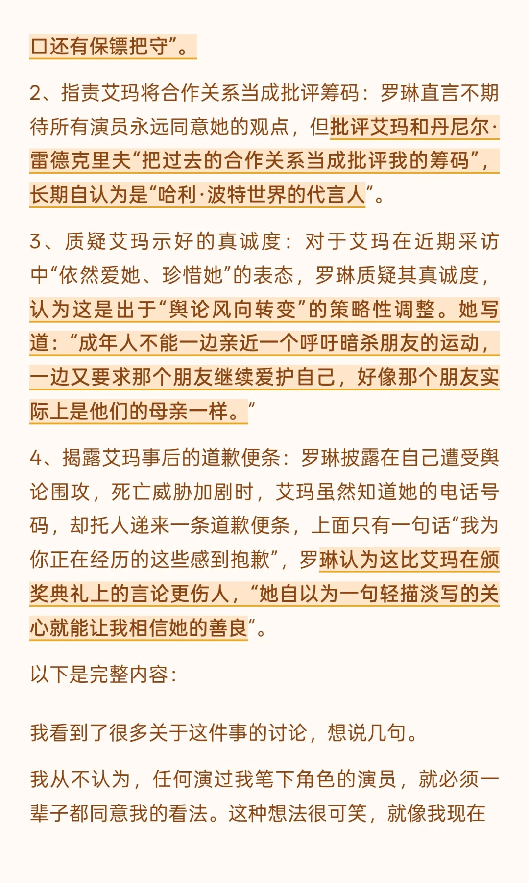 J.K.罗琳回应艾玛·沃特森批评,指责其将合作关系当成批评筹码,质疑其示好真诚度,并揭露其事后的道歉便条。 罗琳强调,演员不必永远同意她的观点,但艾玛和丹尼尔不应长期作为她的代言人。 艾玛不是赫敏,jk罗琳才是。 原著党表示小说比电影精彩10倍,而这部电影部分演员整这么一出 比小说和电影都精彩。