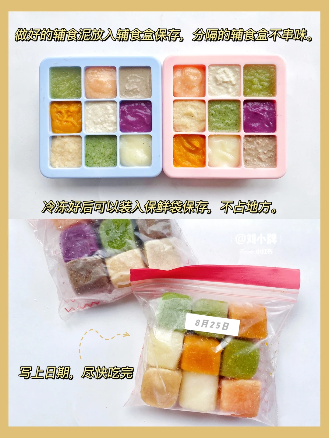 做好的辅食泥要放在辅食盒里储存,冷冻可以保存1个月。也可以冷冻好后取出装入保鲜袋中,标注好日期,一次一块,随吃随取。