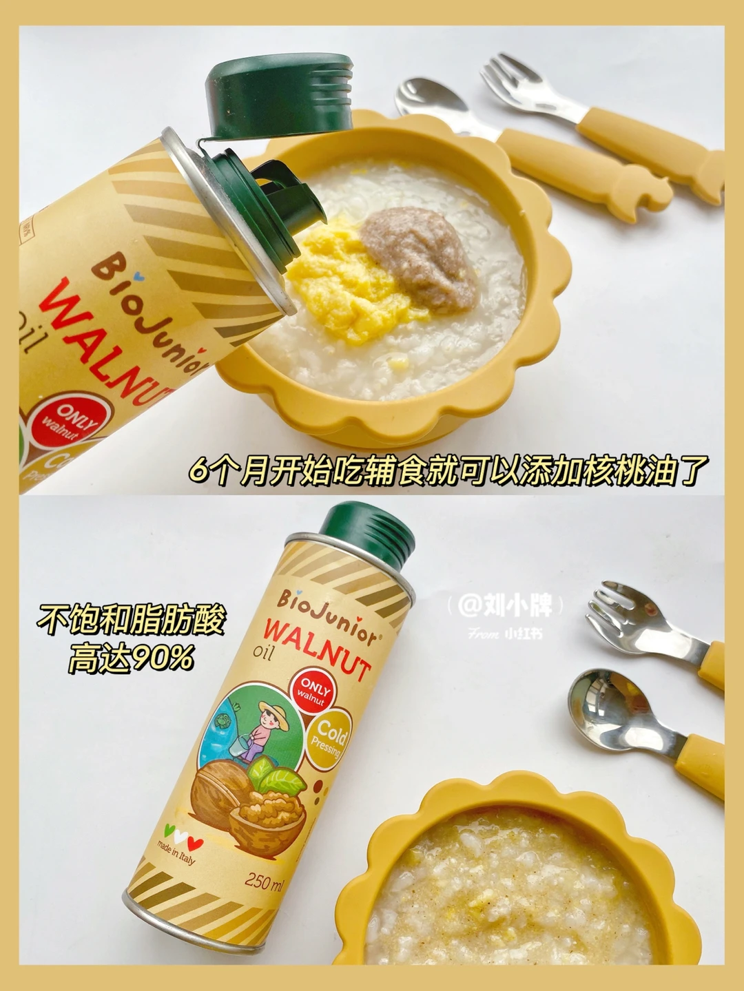 🥬蔬菜泥和肉泥可以加在米粉、粥、面条里一起混合吃。❣️吃之前我都会添加几滴碧欧奇的核桃油,他家的核桃油我们都记不清吃了多少瓶了,从6个月开始吃辅食时就可以添加核桃油了。❣️这款核桃油不饱和脂肪酸高达90%,直接添加在辅食里不仅增香又丰富了营养,避光的金属罐装也能很好的防止的油脂氧化,避免产生有害物质。
