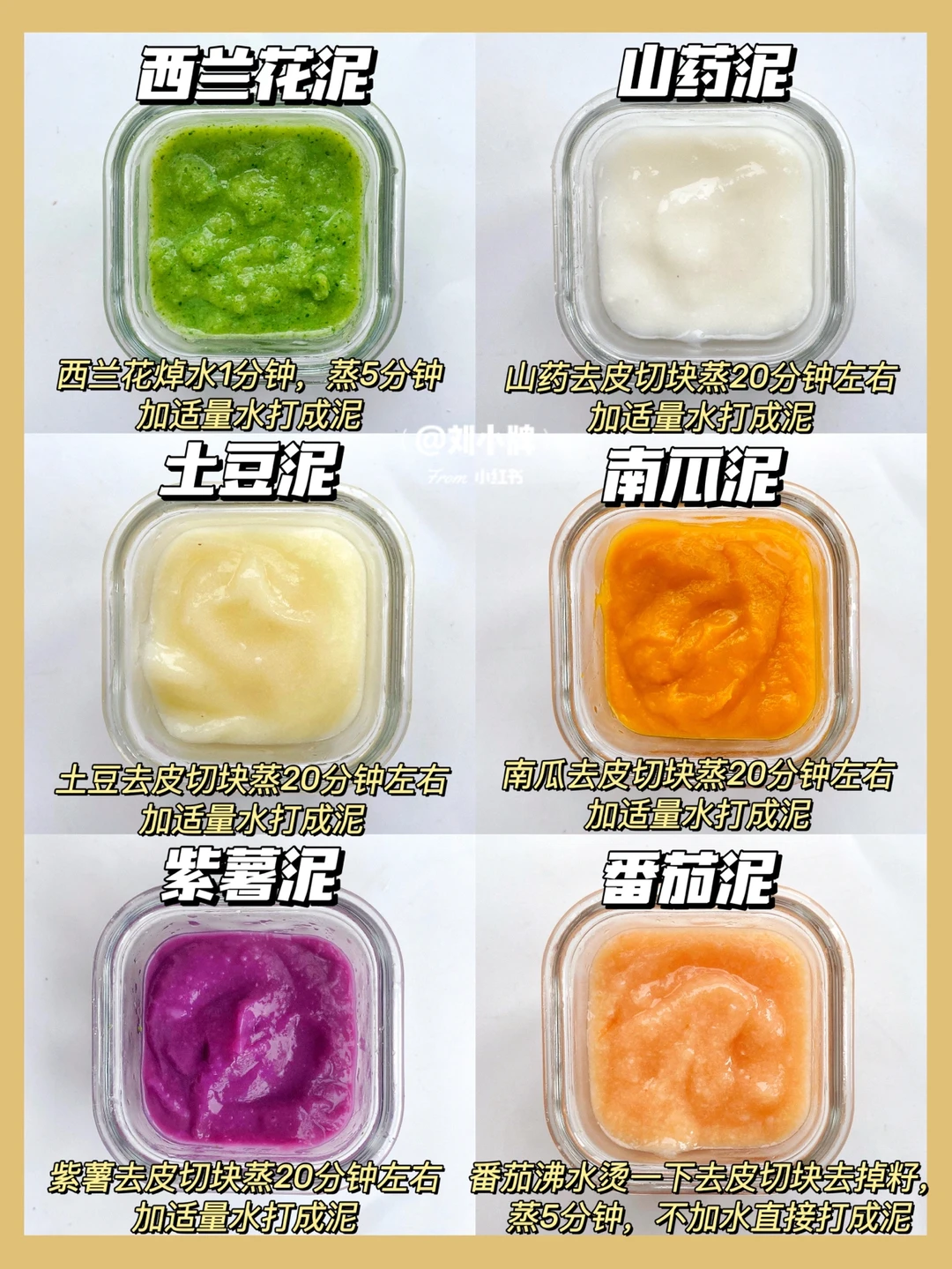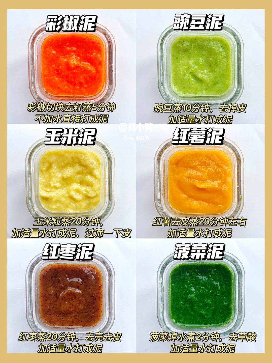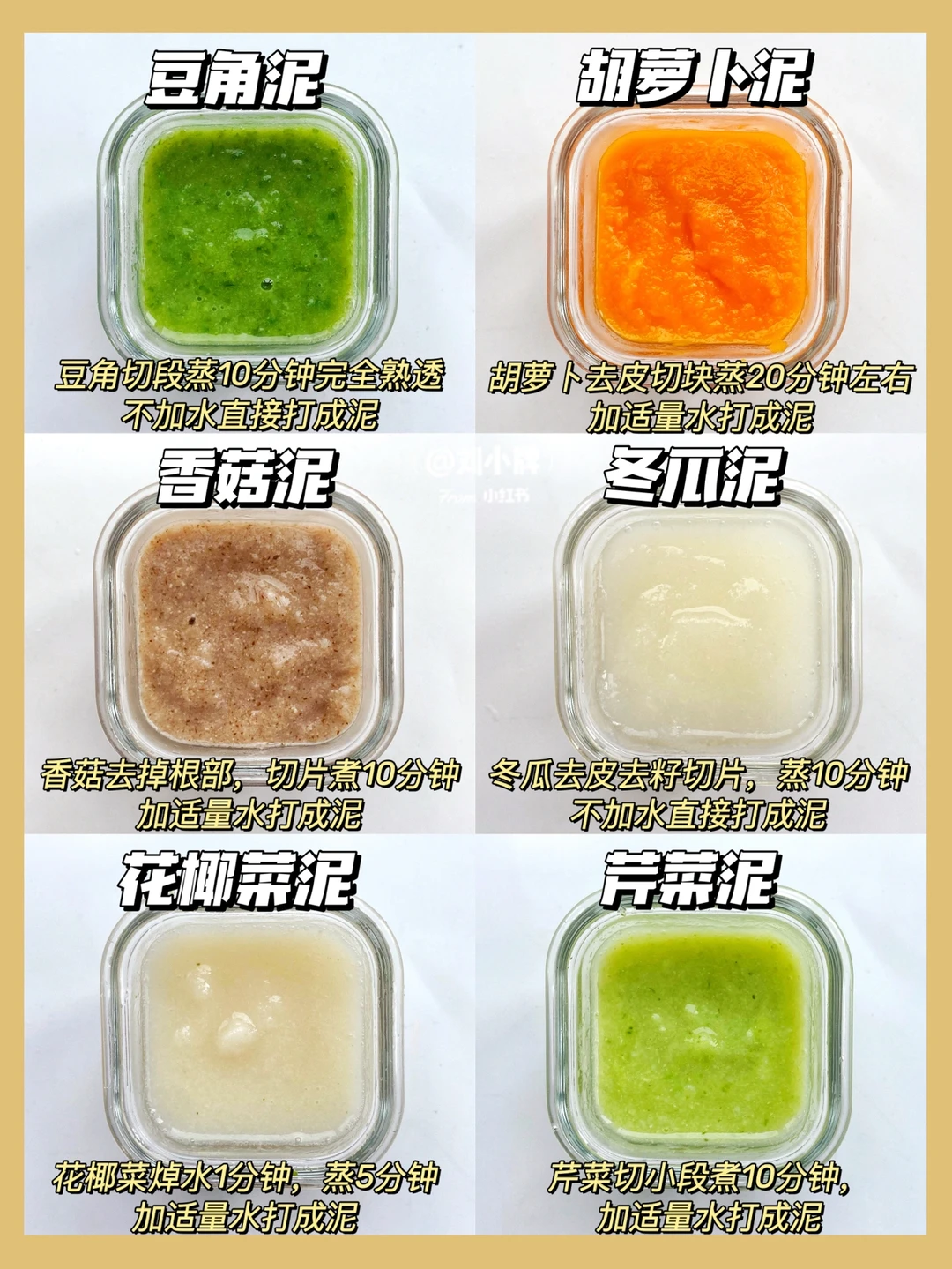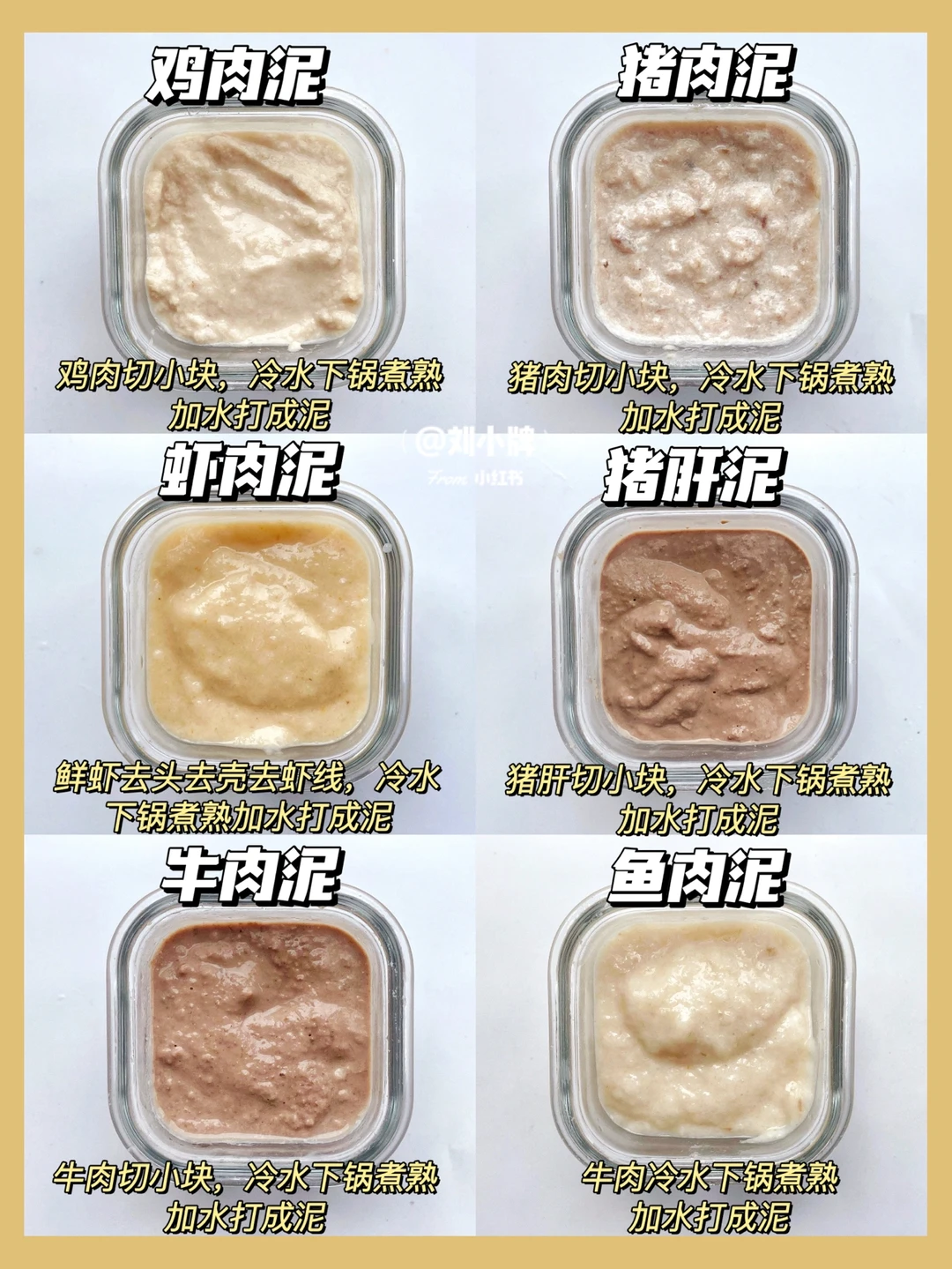 图片中已经给出详细的做法,宝宝的肠胃还没有发育完全,所以大多数蔬菜可以蒸一下,比较软,容易消化。🥩肉类泥可以用柠檬片去腥,我们家没有去腥过,保留食材原本的味道。