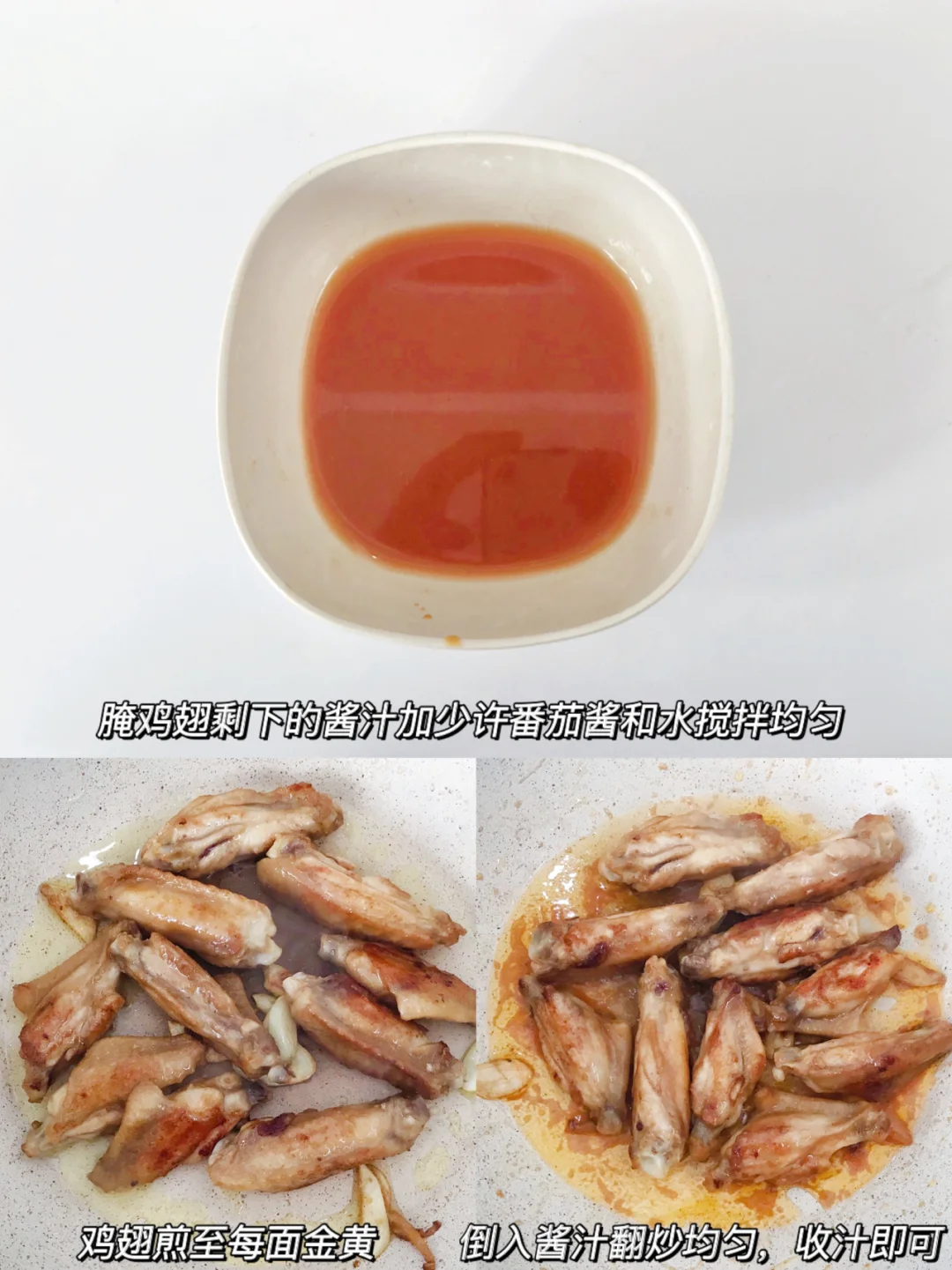 5.腌制鸡翅剩的料汁加少许番茄酱和水调成酱汁,将酱汁淋入锅内,翻拌均匀收汁即可。