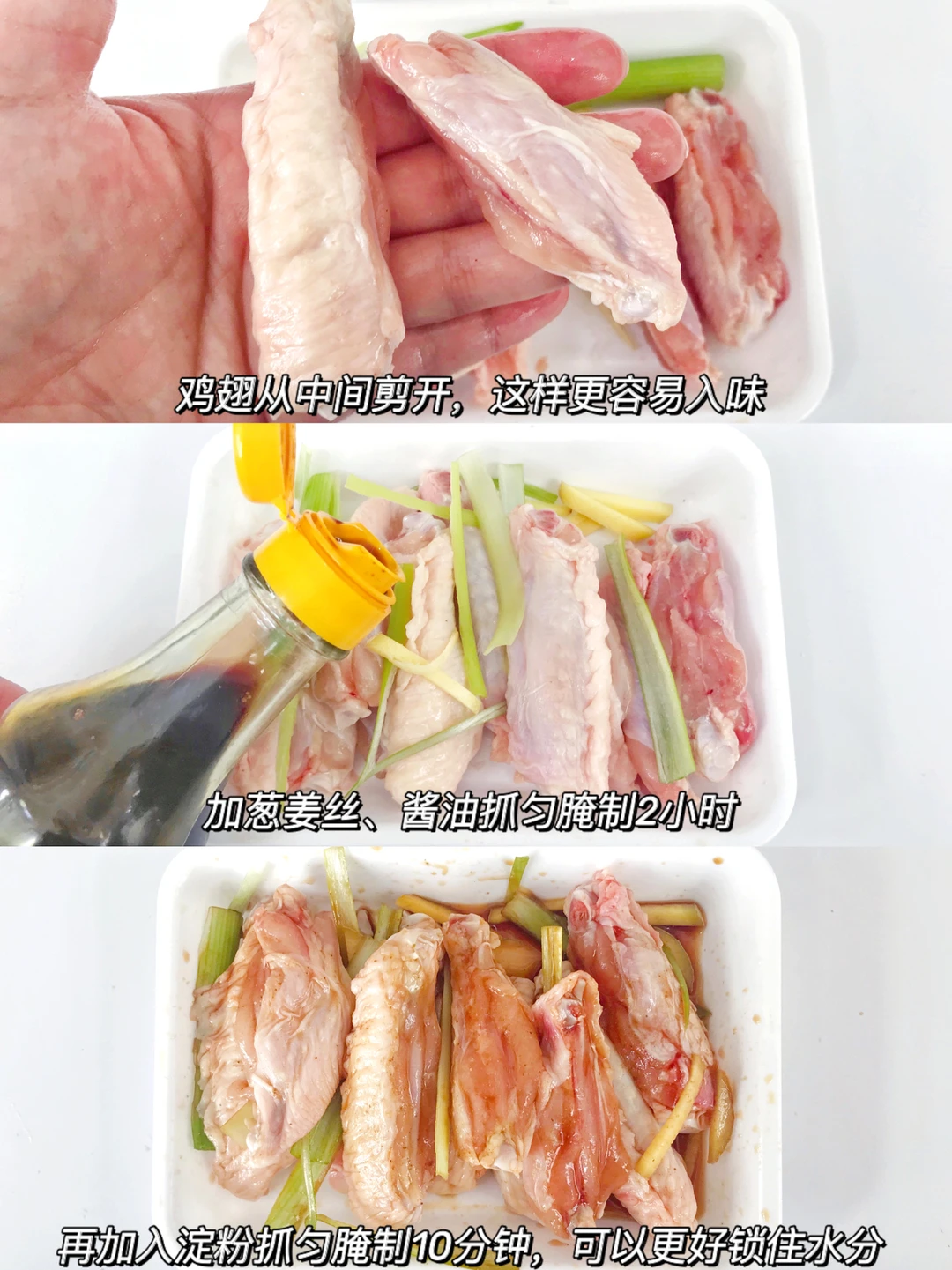 1.鸡翅从中间剪开,加葱姜酱油腌制2小时。