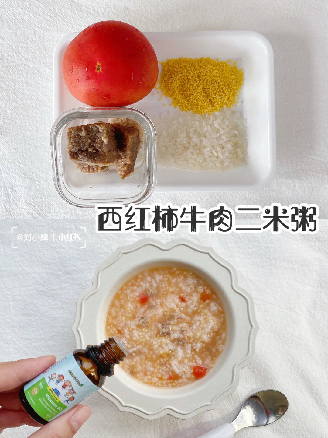 牛肉提前炖熟切碎末,西红柿去皮切小块,锅中放一点油将西红柿炒出汁后,加入煮好的二米粥和牛肉碎。