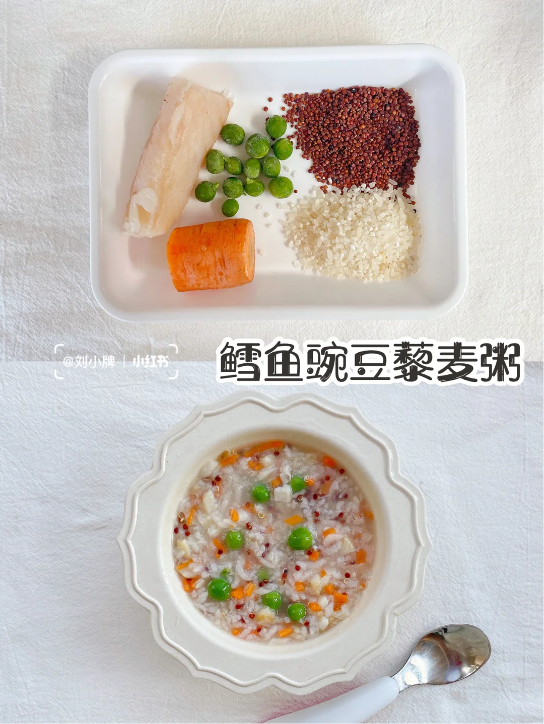 真鳕鱼加葱姜腌制后蒸熟,切碎备用。大米藜麦煮粥,加入焯过水的豌豆和胡萝卜碎,食材全部煮熟后加入鳕鱼即可。