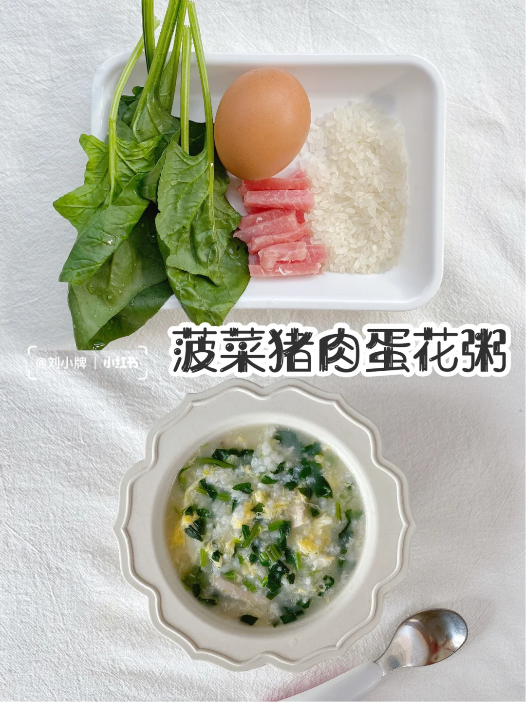 菠菜焯水去草酸切碎末。大米加水煮成粥后放入猪肉菠菜碎,煮至食材全部熟透后淋入蛋液,关过出锅。