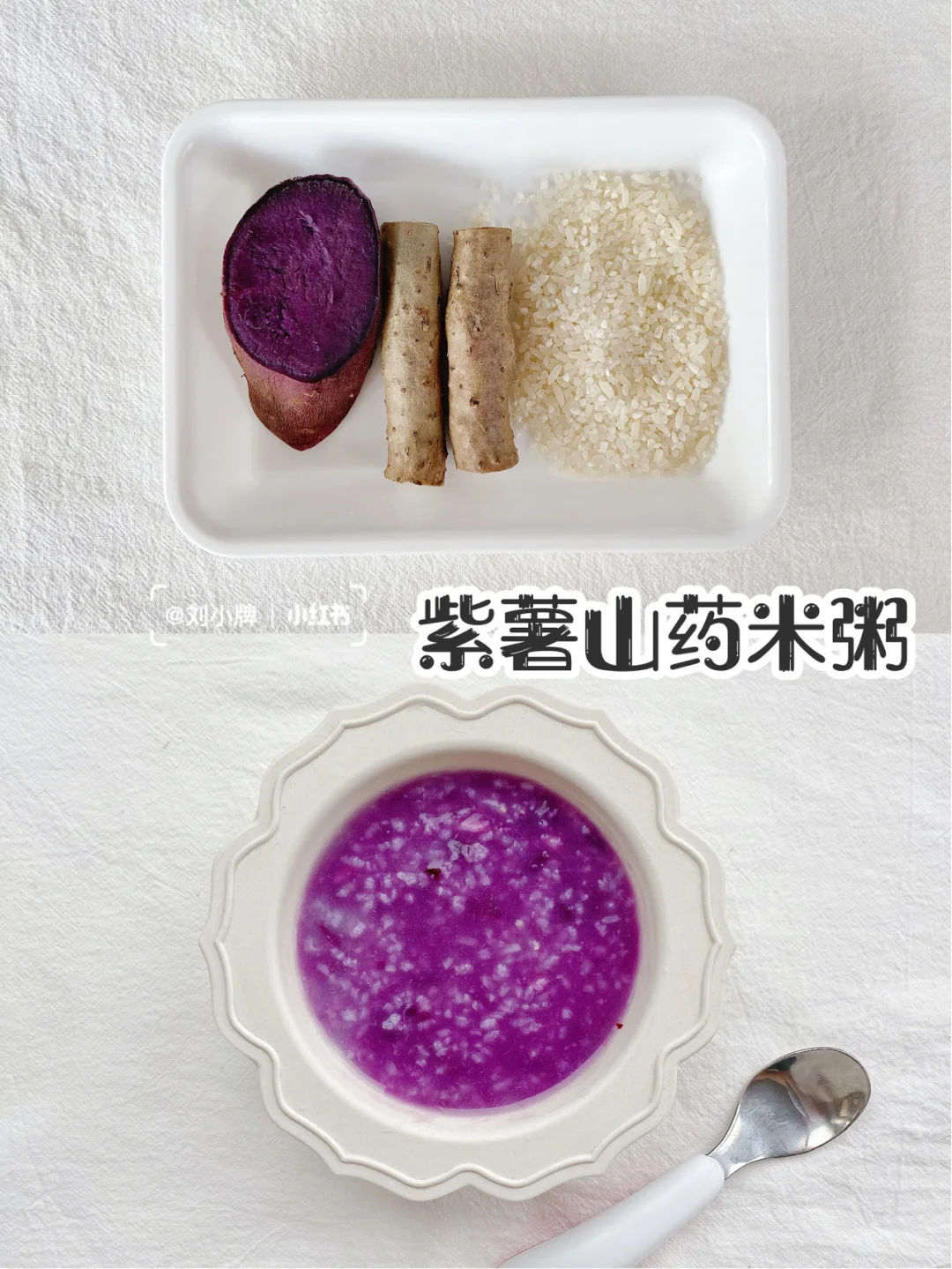 紫薯山药蒸熟,压成泥。放入煮好的大米粥拌匀。也可以用生的紫薯山药去皮切小块和大米一起熬粥,口感没有压成泥那么细腻。