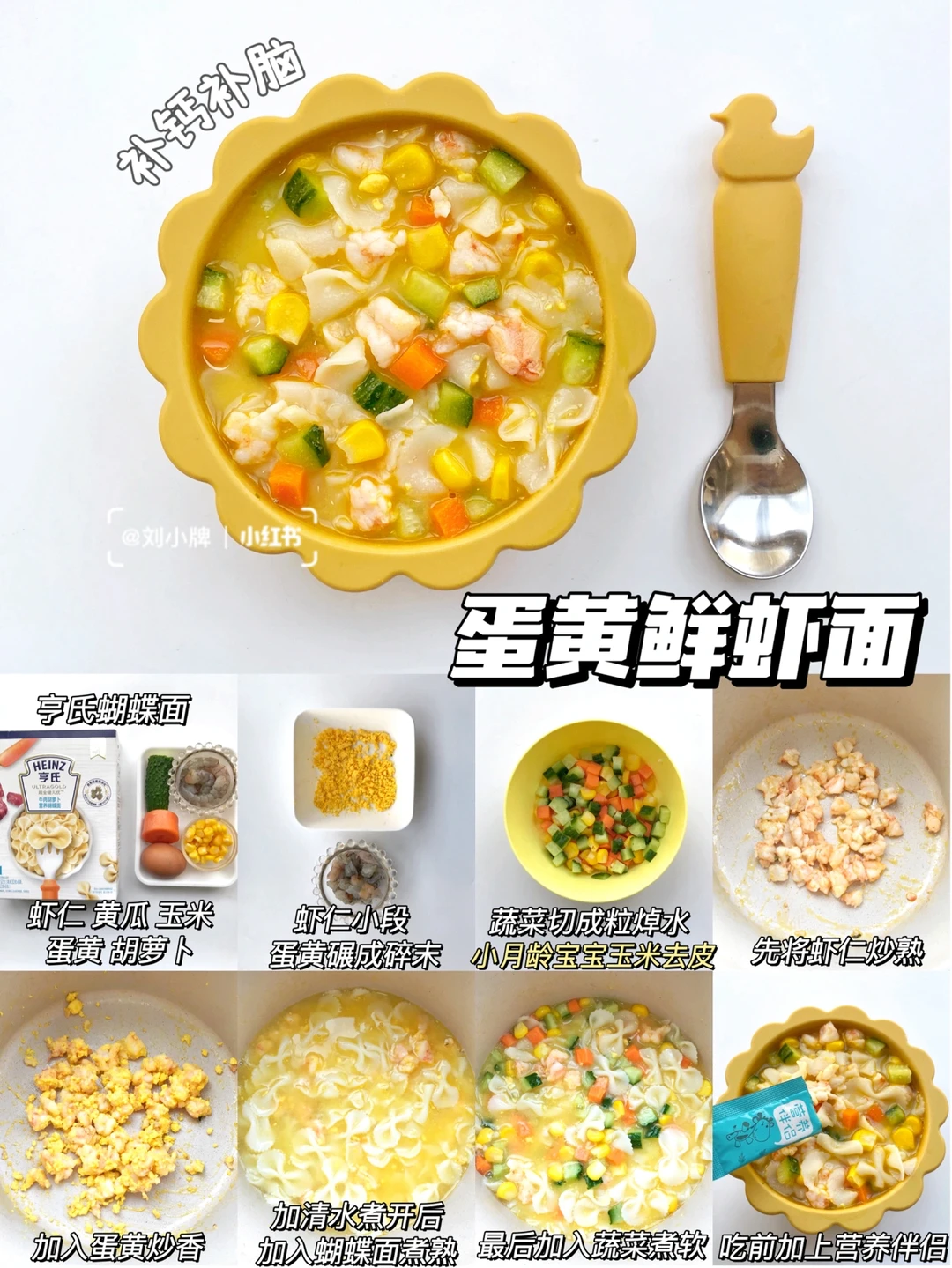 蛋黄、虾仁、胡萝卜、黄瓜、玉米、亨氏蝴蝶面