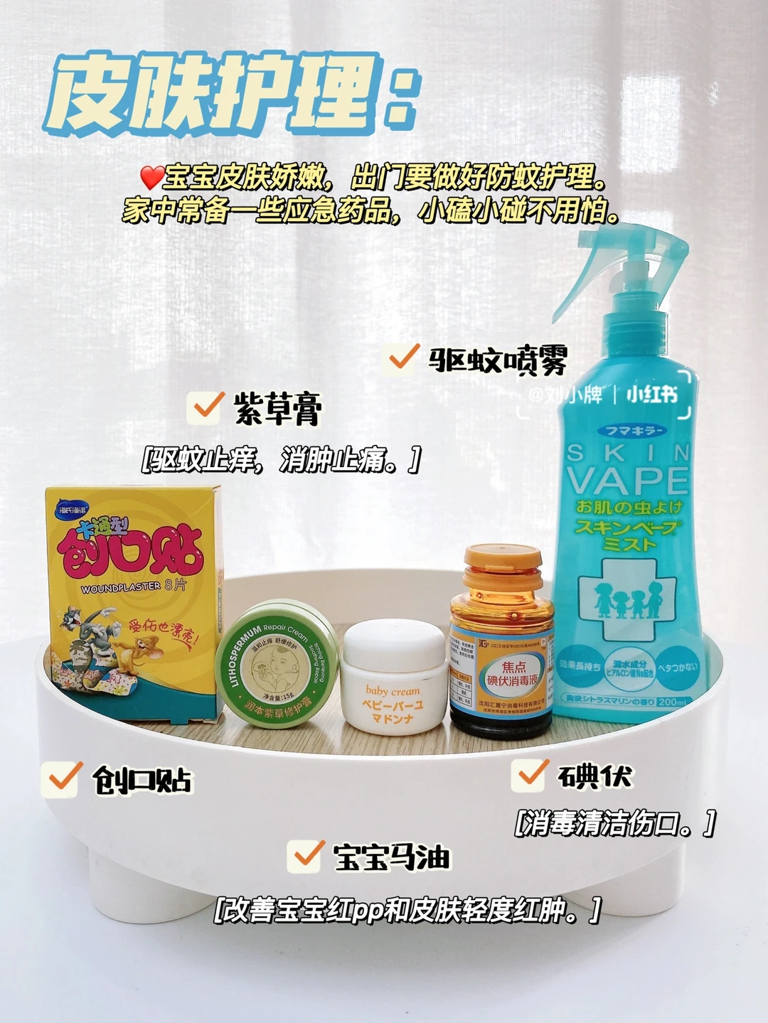 赞赞这个年龄的小朋友几乎没有湿疹的问题了,马油一直准备着,可以缓解皮肤轻微红肿等一些小问题。出门要做好防蚊防虫的准备,创口贴和碘伏家中要常备,小磕小碰可以清洁保护伤口。这款紫草膏还挺好用的,天然不刺激,涂抹之后就不痒了。