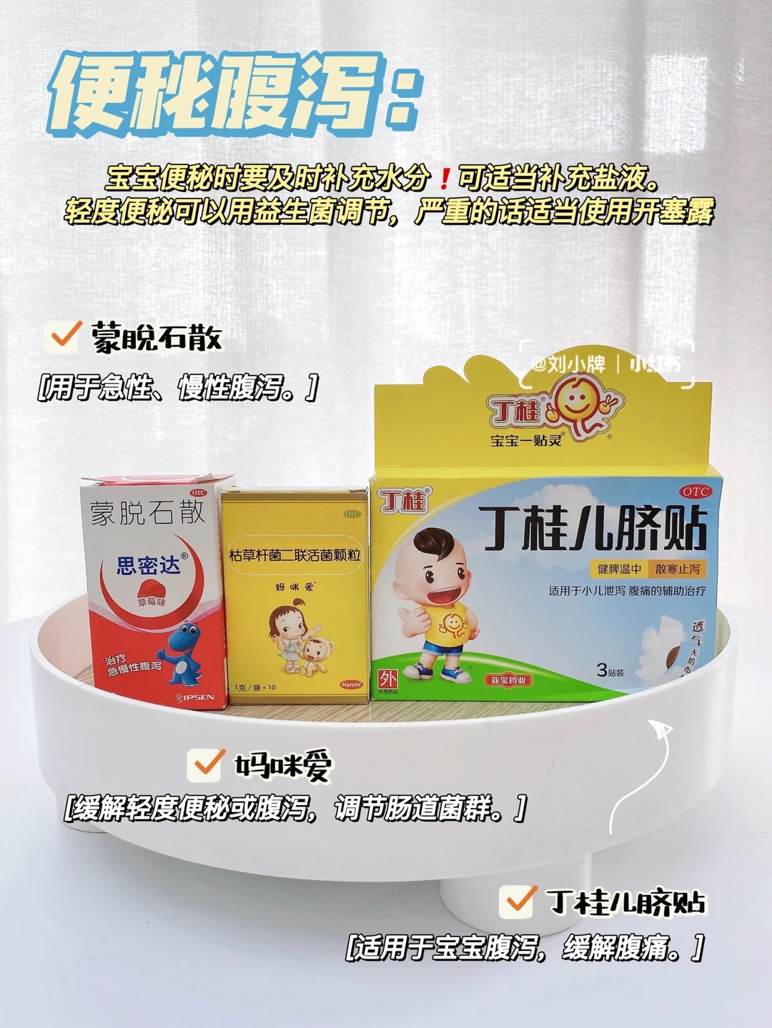 秋冬是宝宝腹泻的高发期,宝宝如果出现腹泻,要及时补充水分防止脱水。妈咪爱是赞赞在月子里就开始吃了,小婴儿胃肠发育不全,可以用这个来调节。蒙脱石散针对急性、慢性腹泻可快速缓解。