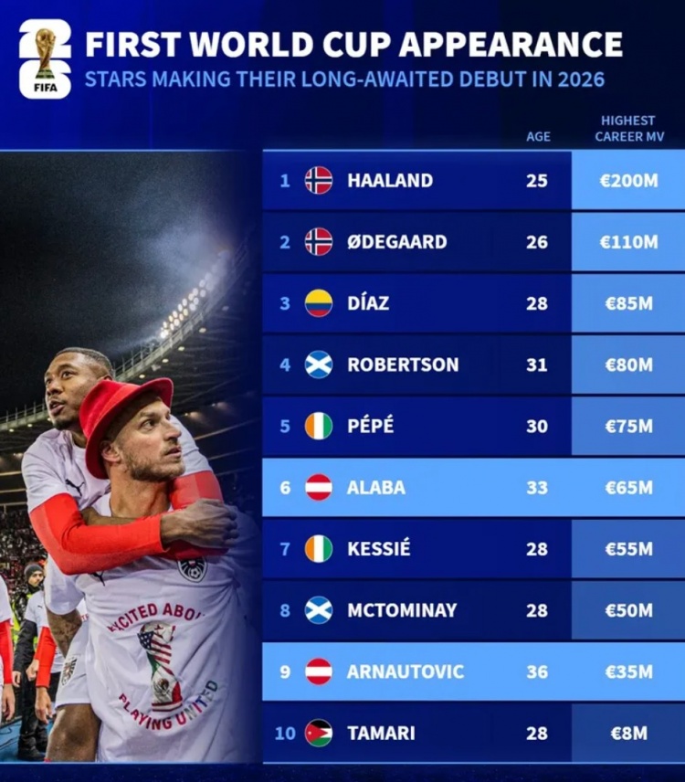 直播吧11月20日讯世界杯预选赛仅剩6个附加赛名额待定,多支国家队实现了晋级梦想,《转会市场》也列出了多位已经为世界杯首秀等待多年的名将。